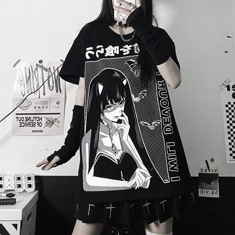 Женская футболка с коротким рукавом Dark Academia, Готическая свободная футболка в стиле аниме Харадзюку, уличная одежда для девушек