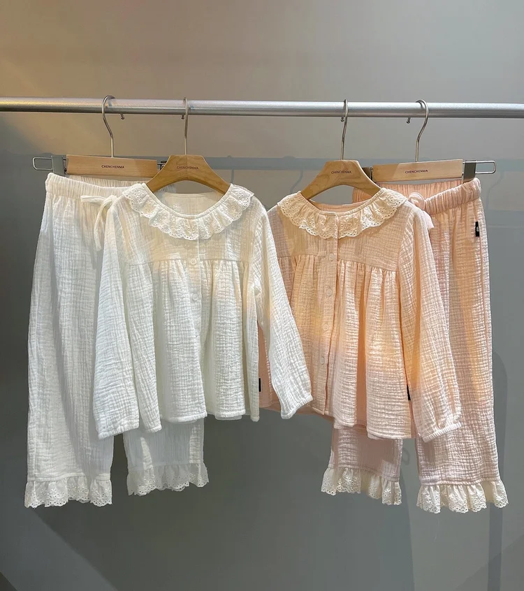Милые пижамные комплекты из хлопка и крепа в стиле "Лолита" с круглым вырезом для маленьких девочек, Детский кардиган, пижамный комплект, домашняя одежда для сна, детская одежда