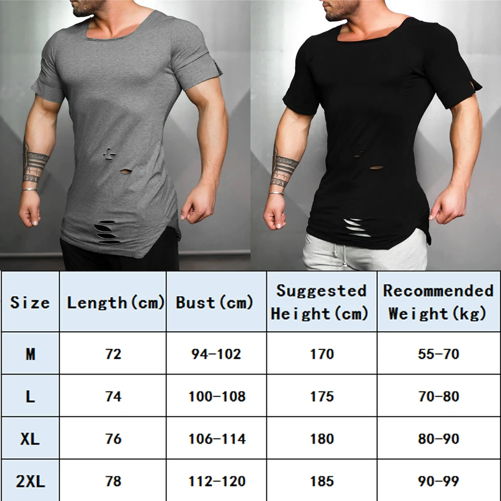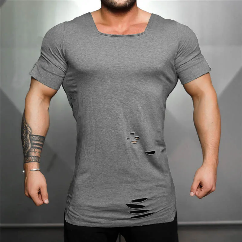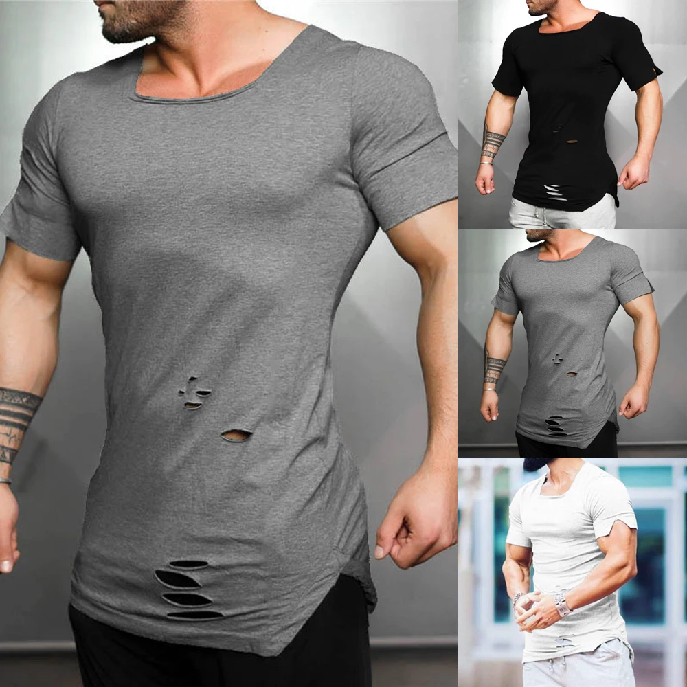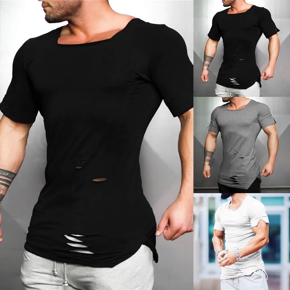 Футболка мужская с коротким рукавом, модная рубашка с дырками в стиле хип-хоп, рваная блузка, крутая однотонная с коротким рукавом, лето