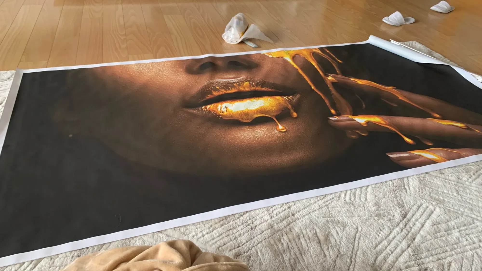 Картина маслом на холсте Черная Женская с золотыми сексуальными губ...