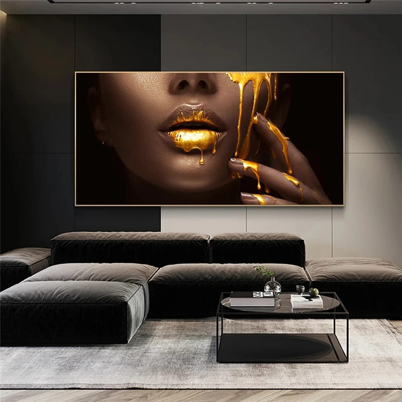 Картина маслом на холсте Черная Женская, с золотыми сексуальными губами, Настенная картина для современного дома, Настенный декор гостиной без рамки