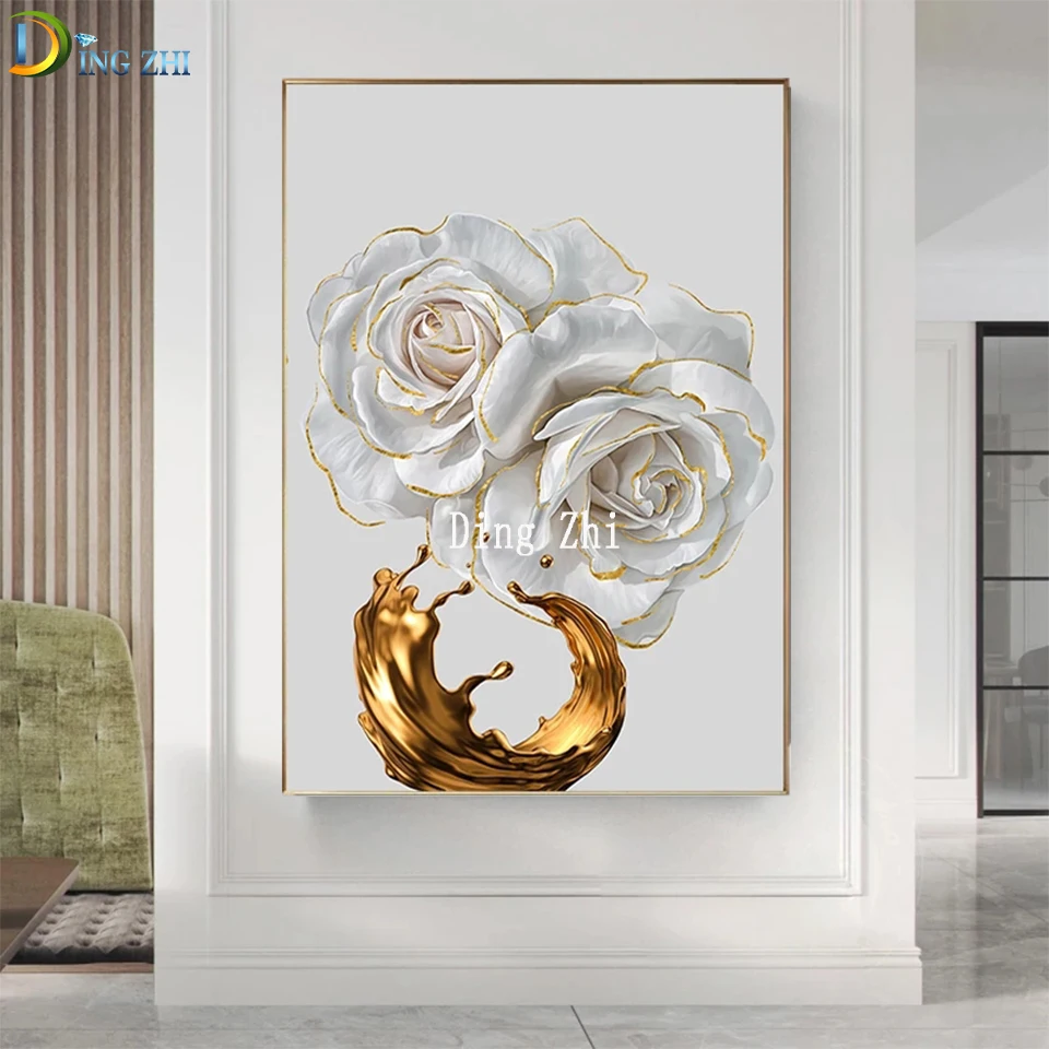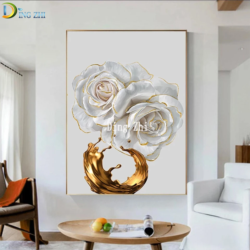 5D алмазная живопись, роскошная картина с цветами, квадратная вышивка, вышивка крестиком, белая роза, золотые чернила, брызги, Алмазное искусство