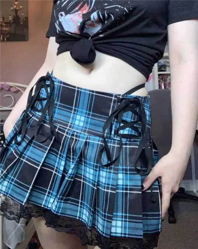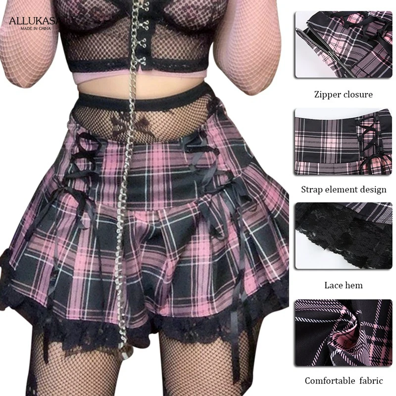Allukasa Новая Сексуальная кружевная клетчатая плиссированная юбка в розовую полоску в клетку в стиле панк темная Академия одежда для E-Girl Y2k юбки