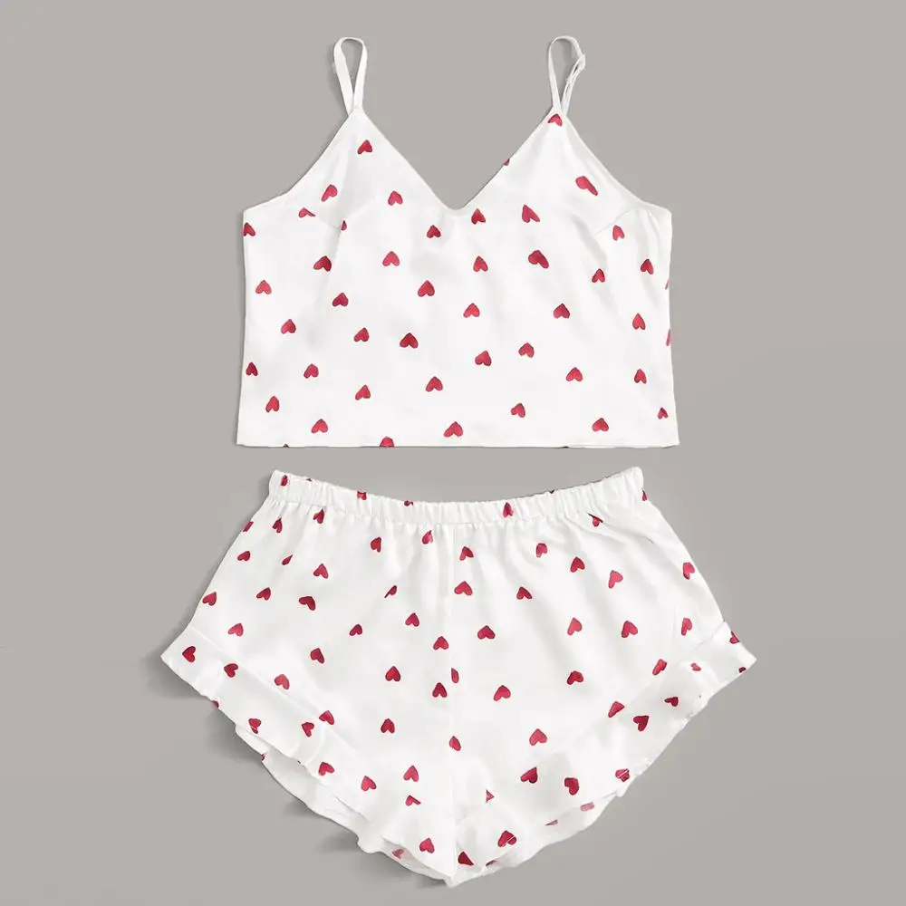 Пижама женская атласная с принтом в виде сердца, топ с оборками, ни...