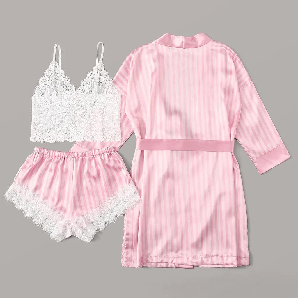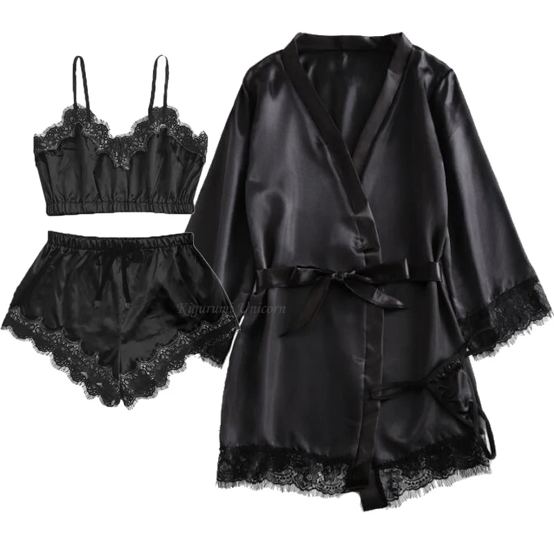Комплект пижамный Женский, Шелковый, черный, атласный, кружевной, из 3 предметов, топ на бретелях и штаны, весна-лето, домашняя одежда, ночная рубашка, банная сорочка, S-XL