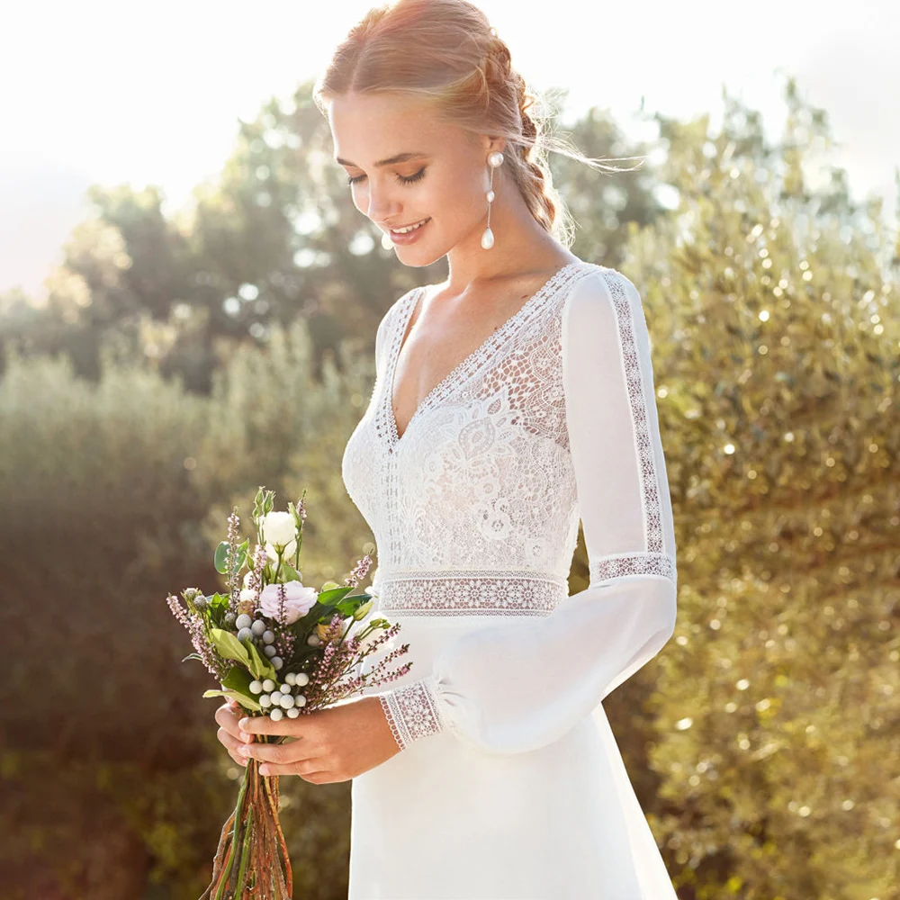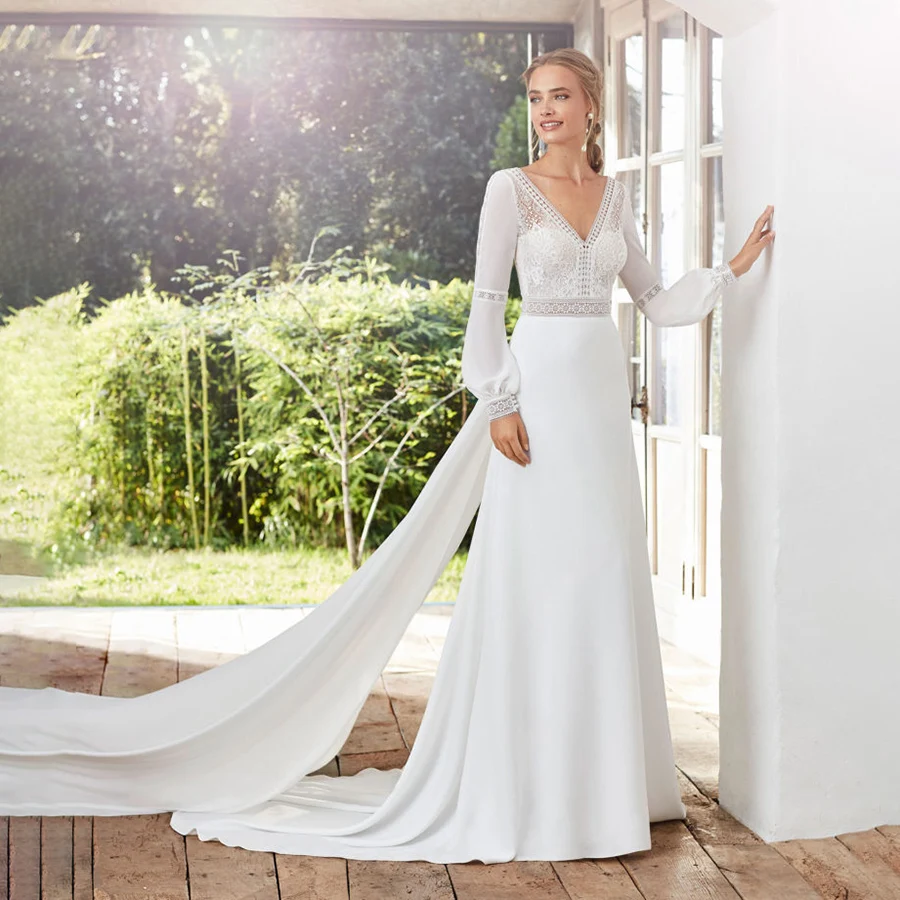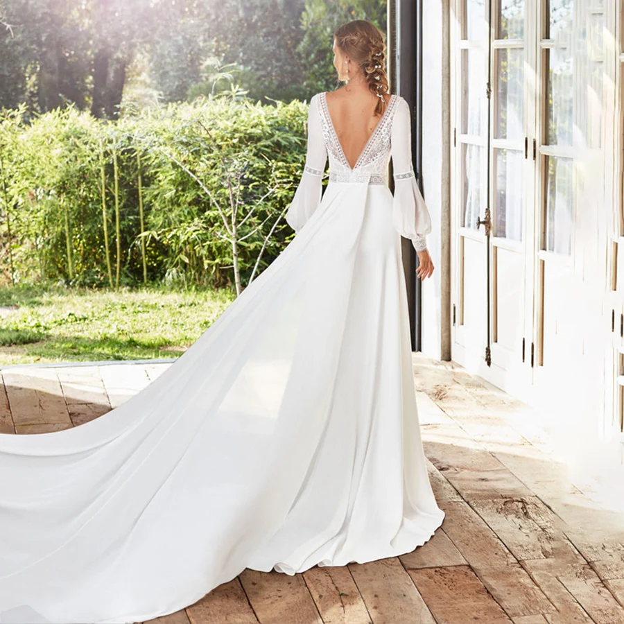 Шифоновое свадебное платье с длинными рукавами-фонариками, V-образным вырезом и открытой спиной, 2021