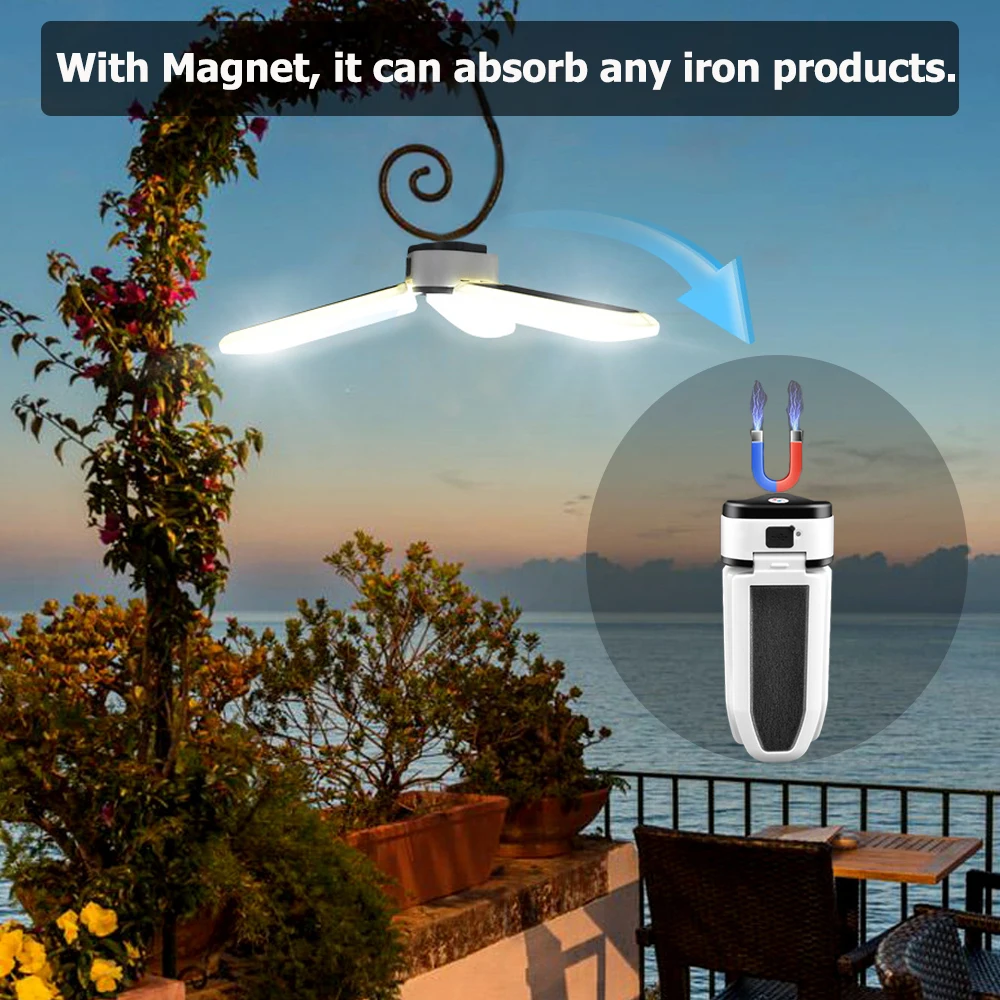 4. Удобный дизайн: 60 супер ярких светодиодов и 3-створчатая складная конструкция направлены на широкую зону освещения, и легко регулировать угол и зону освещения. Скрытая конструкция подвесного крючка позволяет разместить светильник на открытом воздухе, например светильник кемпинга или веток деревьев.