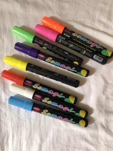 8 ярких цветных жидких порошковых ручек для гладкого письмаВ этих жидких пастельных маркерах используются уникальные чернила, чтобы сделать цвета более vivid. Наши флуоресцентные цвета стимулируют ваше творчество.Людям понравится использовать эти яркие, красочные маркеры на самых разных поверхностях (включая зеркала, окна и другие непористые поверхности), чтобы выразить свой творческий потенциал. Очень подходит для использования на досках меню, досках, досках, календарные наклейки, наклейках на стену, окнах дома, окнах автомобиля, пластике, металле и т. Д.Идеально подходит для ресторанов, магазинов и баров, с яркими и привлекательными знаками для бистро, досками меню ресторанов, витринами магазинов и другими способами самостоятельного привлечения клиентов.Меры предосторожности1. Пожалуйста, напишите на гладкой непористой поверхности, иначе она не будет очищена2. При письме предмет, который нужно написать, должен быть поставлен плоским; Подождите, пока почерк высохнет, прежде чем стоять в вертикальном положении3. Не допускайте использования детьми младше 3 лет для предотвращения случайного проглатывания