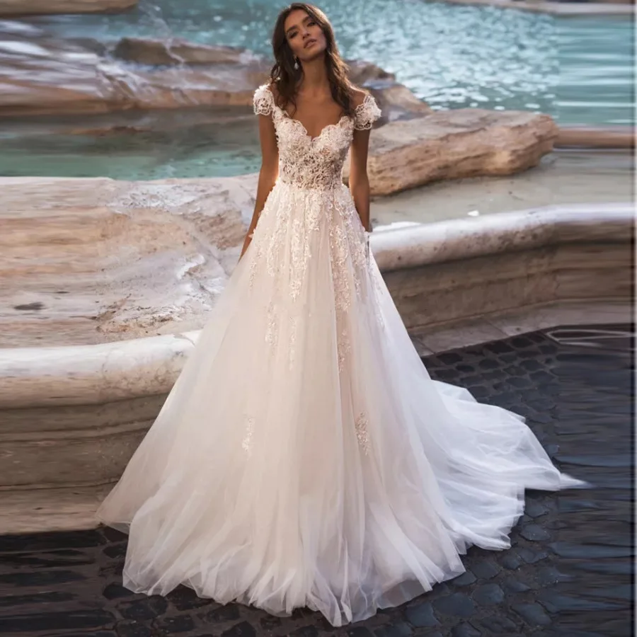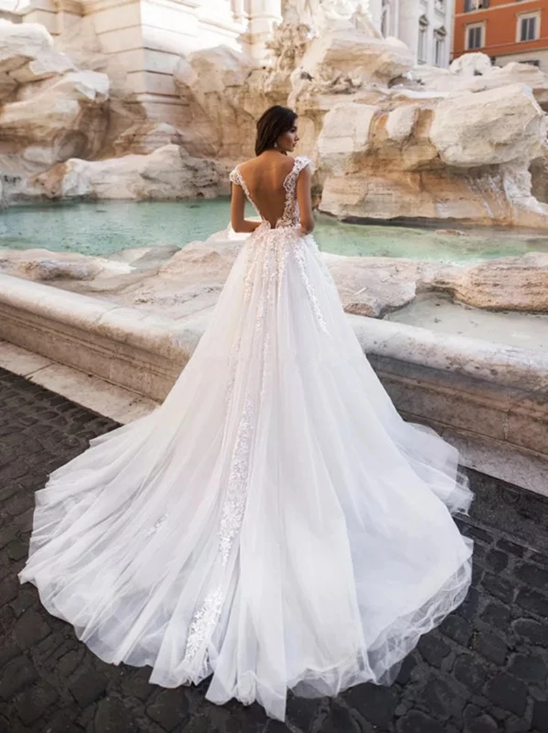 Пляжные свадебные платья, трапециевидного силуэта, с коротким рукавом, V-образным вырезом, кружевными аппликациями, официальный Тюль 2021, с открытой спиной и шлейфом, пикантное свадебное платье