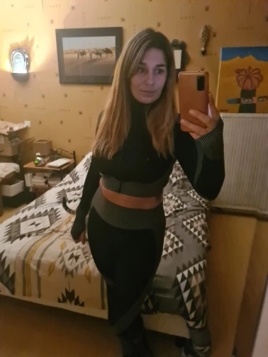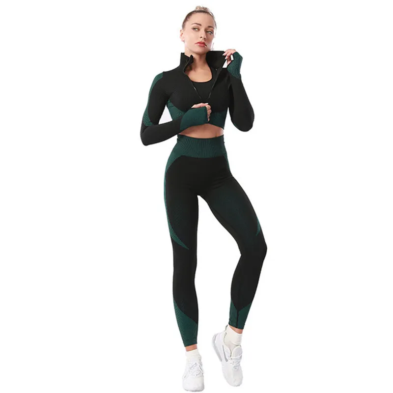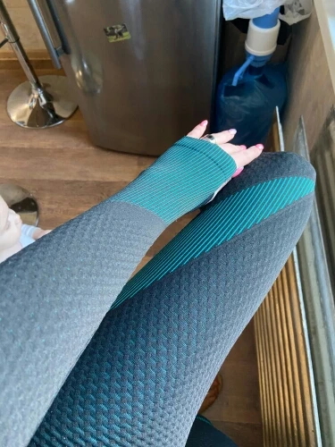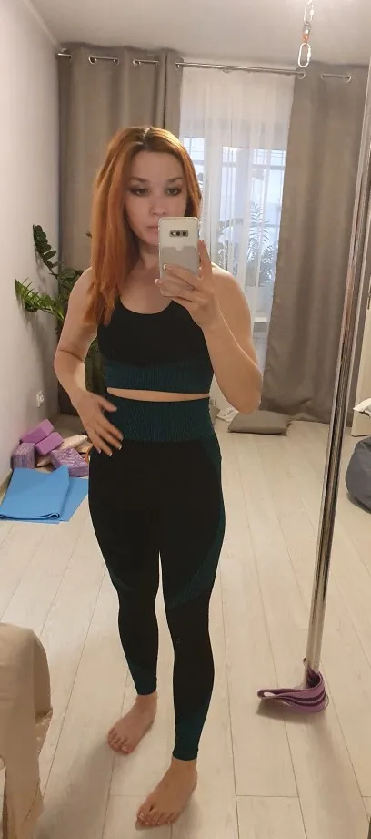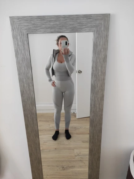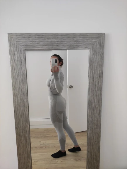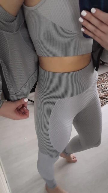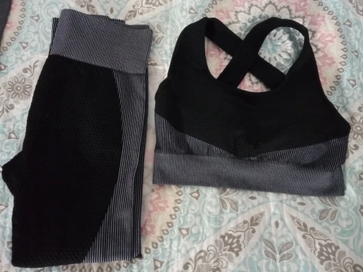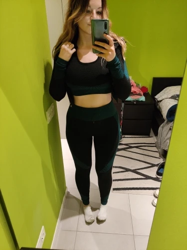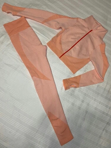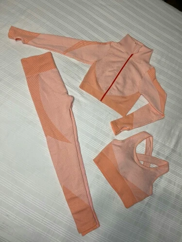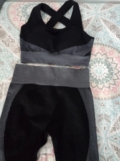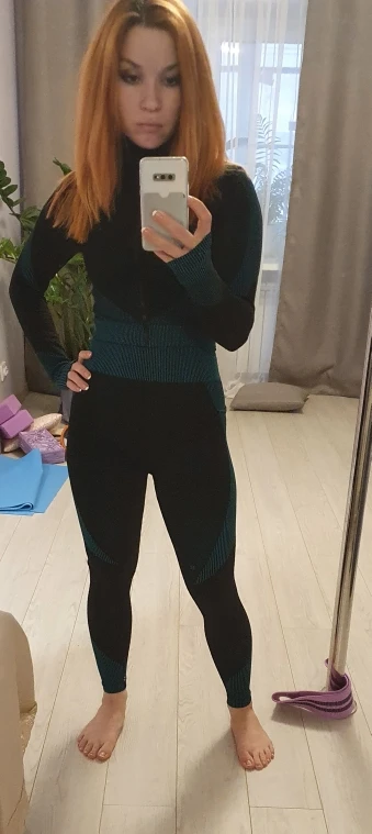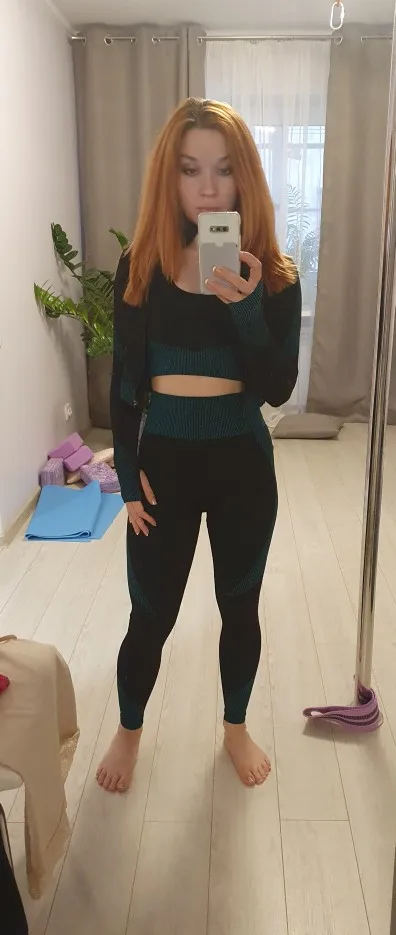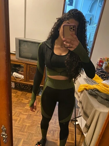 Качество хорошее, цвет тоже (хотя зеленый более электрический, чем военный). Размер S маленький, но очень гибкий. Мне нравится свитер, а верх очень удобный, с открытой спиной. Тем не менее... Глаз, что колготки прозрачные! При нормальном ходьбе нет, но при тренировке легко прозрачно нижнее белье. Это зимний набор 100%, он теплый. Рекомендуется, но будьте осторожны с прозрачностью!