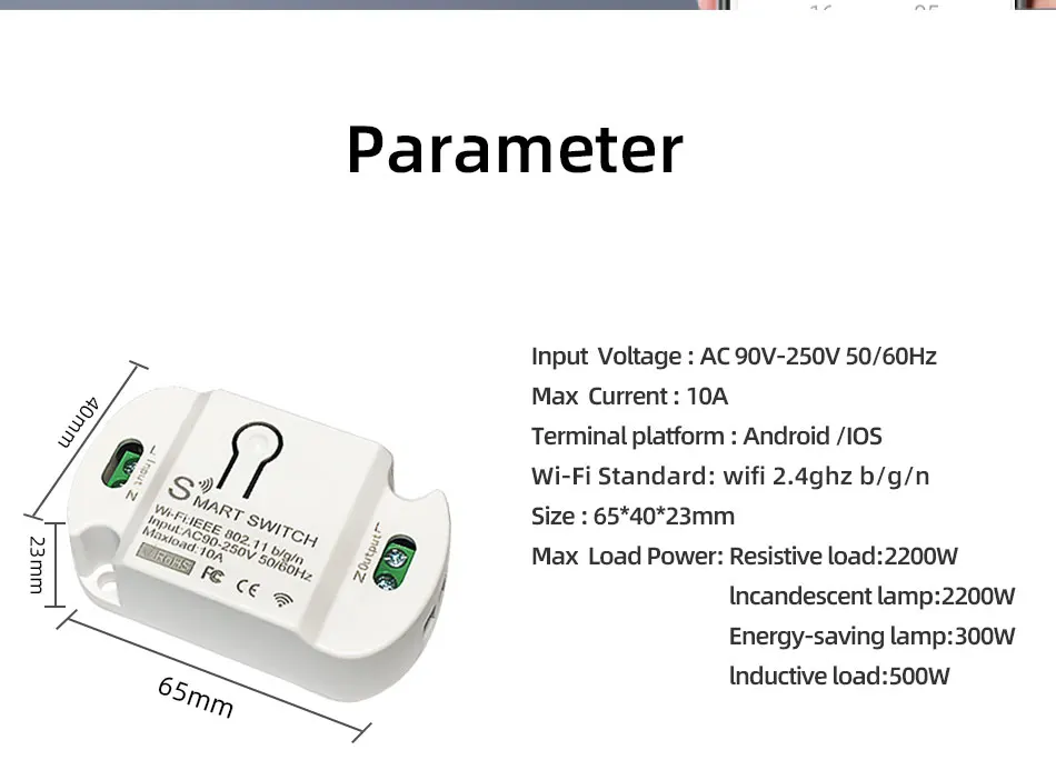 Входное напряжение: AC90-250VВыходное напряжение: AC90-250VРабочая частота: 60 Гц/50 ГцРабочая температура: -20-60 ℃Беспроводной протокол: IEEE 802,11 b/g/nWI-FI 2,4 ГГц (не поддерживает Wi-Fi 5 ГГц)Максимальный ток: 10AРазмер: 65*40*23 (мм)