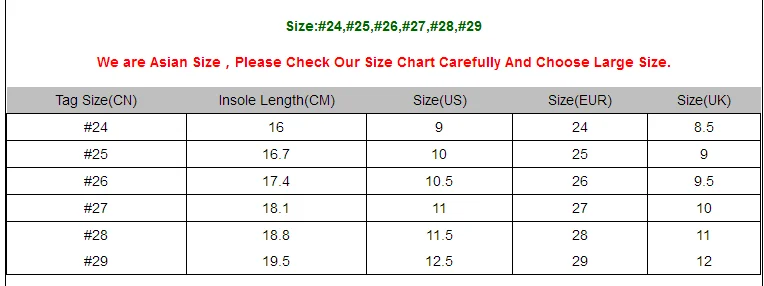 Размер бирки (CN) Длина стельки (дюйм) Размер (США) Размер (евро) Размер (Великобритания) /24 16 9 24 8,5 /25 16,7 10 25 9 /26 17,4 10,5 26 9,5 /27 18,1 11 27 10 /28 18,8 11,5 28 11 /29 19,5 12,5 29 12Пожалуйста, подтвердите размер вашей стопы перед тем, как заказать обувь, спасибо!