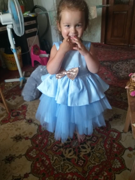 Платье пришло в Украину неделе за 2 Новой почтой курьерской доставкой. Давно присматривала эту модель, у этого продавца самая низкая цена была на момент покупки, и еще продавец давал купон на 1$, платье обошлось в 288грн, это супер цена, брала на девочку 3,5 лет (рост 97см)размер 4T (на платье 110), сидит хорошо, и есть небольшой запас, как раз на ДР в январе будет супер. Ребёнок в восторге) Гладиться хорошо, подкладка внутри из ситца, много слоёв юбки) Цвет небесно голубой, берите не пожалеете))