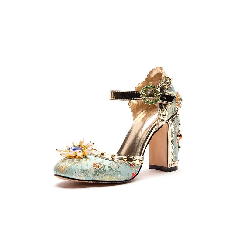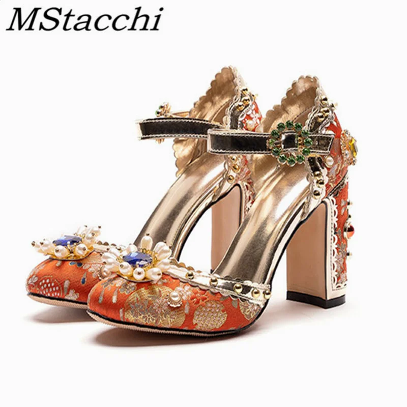 Женские туфли на высоком каблуке MStacchi, новые стильные летние туфли на высоком каблуке с кристаллами, пряжкой, круглым носком, заклепками, туфли с цветком и жемчугом для свадьбы и вечеринки