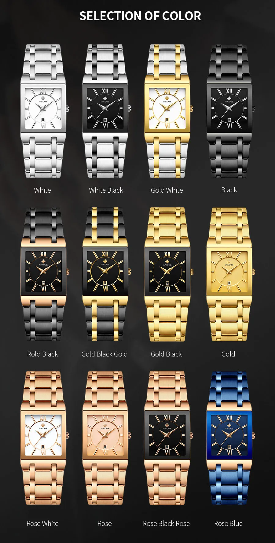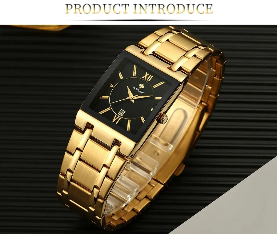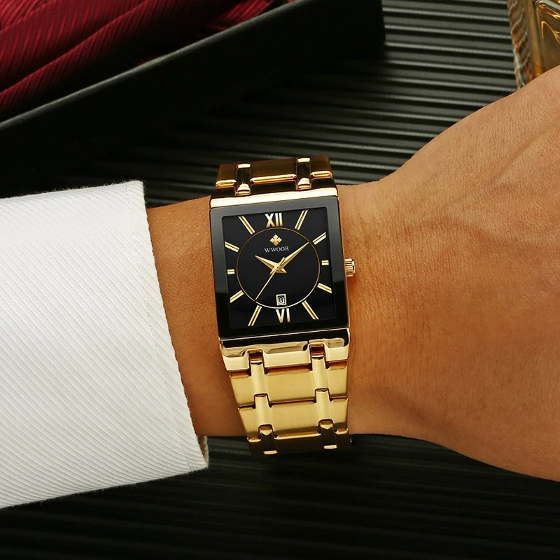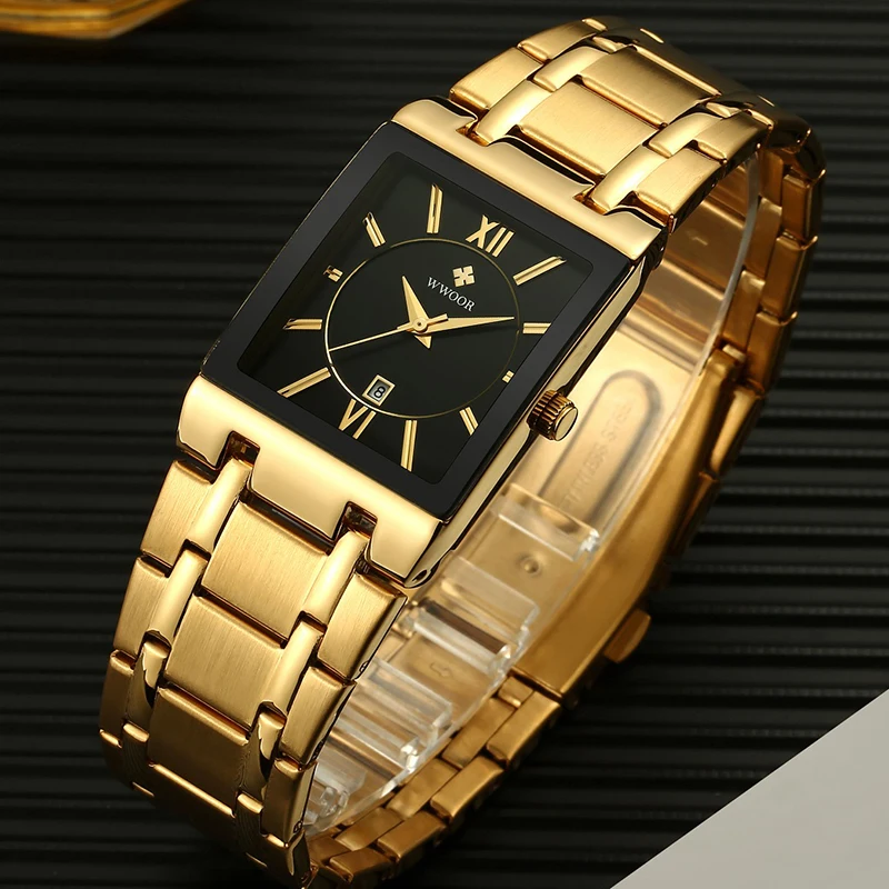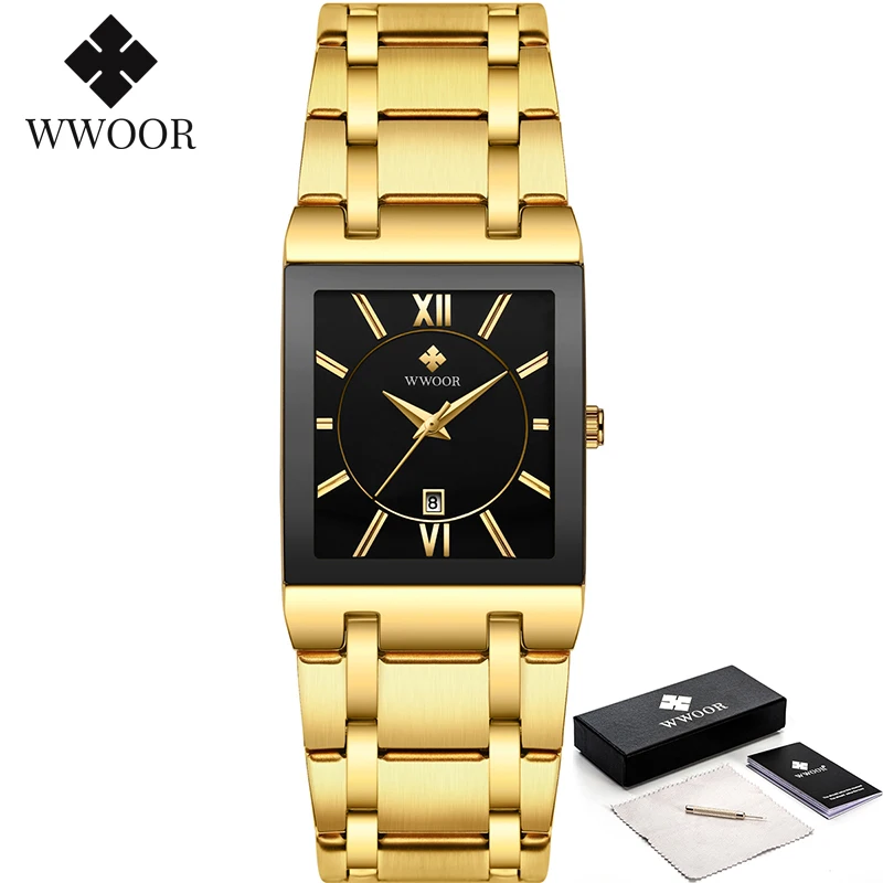 Мужские квадратные часы WWOOR, роскошные золотистые, черные кварцевые наручные часы для мужчин, полностью стальные водонепроницаемые автоматические мужские часы с датой, 2021