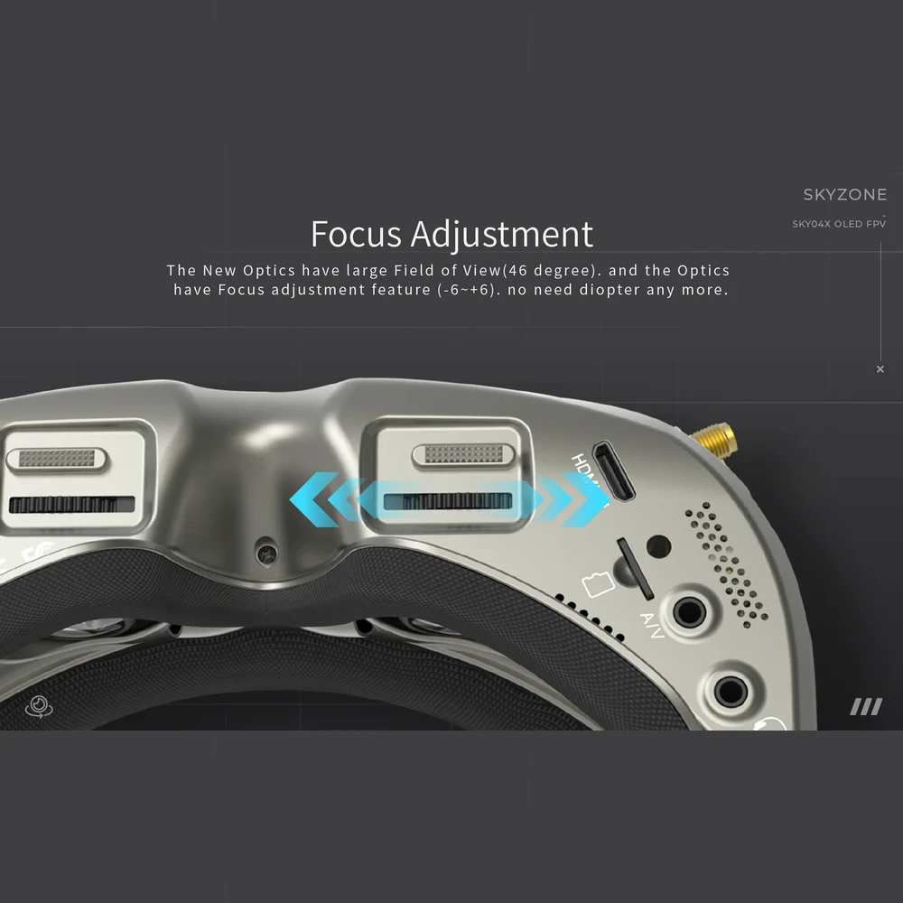 SKY04X является первым goggle skyzone с регулировкой фокуса, экран с высоким разрешением 1280*960 имеет яркий цвет и высокую контрастность, пилот может видеть более подробную информацию в гонках.