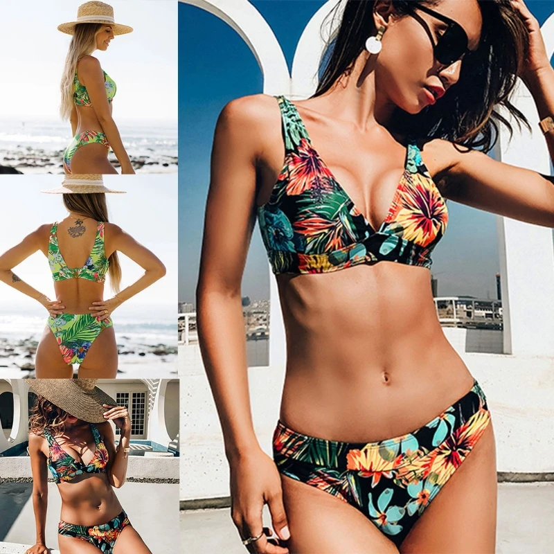 Принт тропических листьев, женский купальник, купальный костюм из двух частей, сексуальный комплект бикини, купальник, водный спортивный пляжный костюм