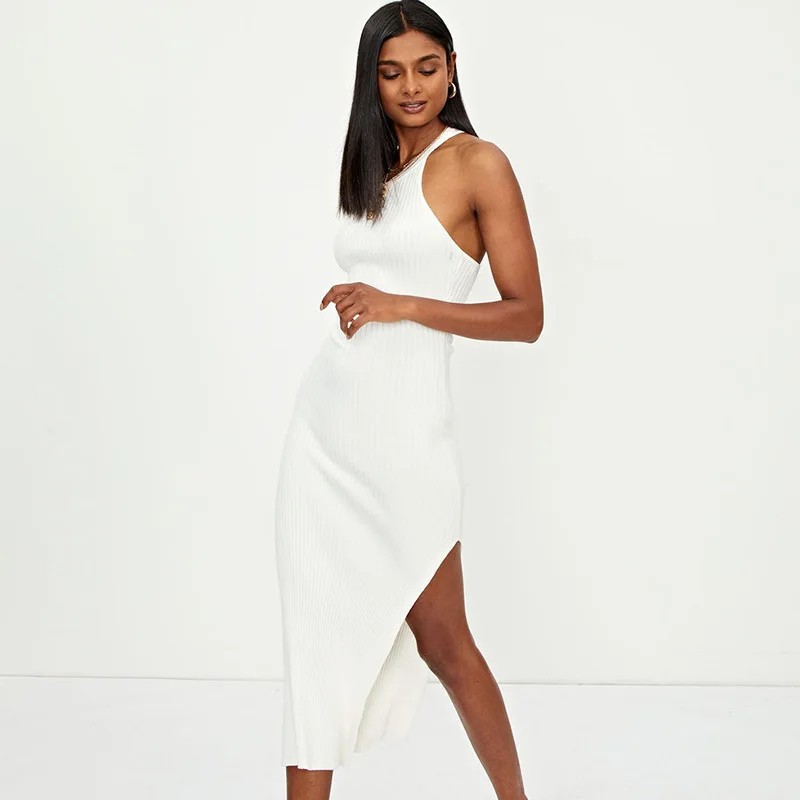 Женское платье-макси с высоким разрезом, длинное облегающее платье в рубчик с лямкой на шее, элегантный белый сарафан, Повседневные Вечерние праздничные платья