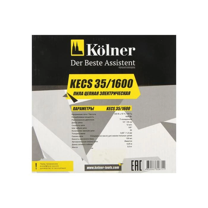 Пила цепная электрическая Kolner KECS 35/1600, 1600 Вт, 14", шаг 3/8", паз 1.3 мм, 52 звена 5102156
