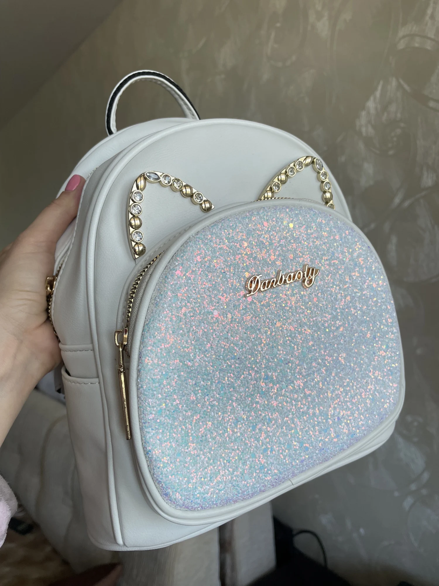 Рюкзак супер. Не маленький, но и небольшой. Брала такой, чтобы влезал большой кошелек. На фото видно, что и в длину и в ширину размер самое оно. Цвет на первый взгляд больше в белый с отливом в серый, но на свету прямо светло светло бежевый. Все стразы на месте, блестки переливаются в розово-оранжевые оттенки. Единственное-они на ощупь шершавые, покрыть бы их прозрачным материалом и было бы все на 5+. Но в целом это одна из лучших моих покупок на Али. Срок стоял 16 мая, приехал 1-го числа. Думаю заказать и другие цвета.