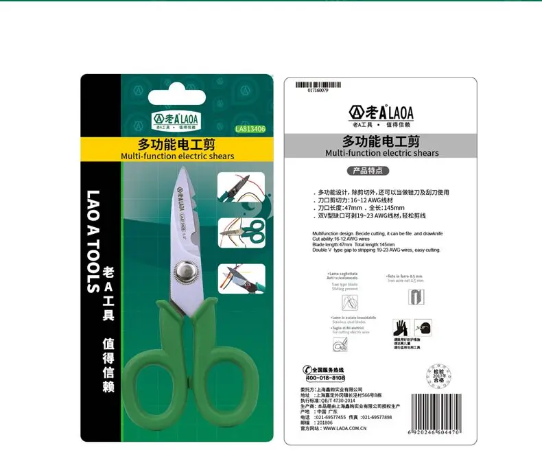Название продукта: Многофункциональные электрические ножницыБренд: LAOA TOOLSМодель: LA813406Общая длина: 145 ммВес: 0,12 кгМощность кромки: 16 ~ 12 AWG проводДлина края ножа: 47 ммИспользование: предназначен для ремонта телефонов, обслуживания приборов, этоУдобные и прочные пластиковые ручки, двойныеV-образная конструкция может прокладывать провод 19 ~ 23 AWG, легкая линия резки.Характеристики: многофункциональный дизайн, помимо резки, можетТакже используется как файл и скребок.