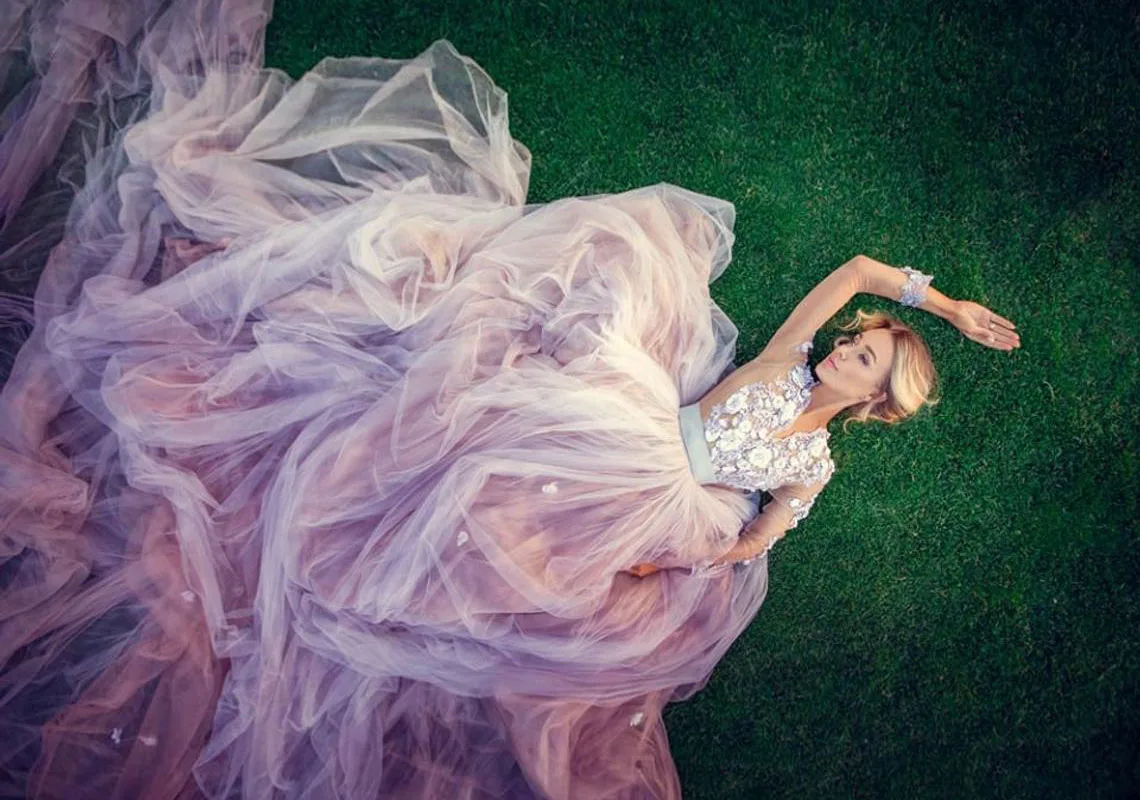 Платье фатиновое с длинными рукавами и оборками, без бретелек