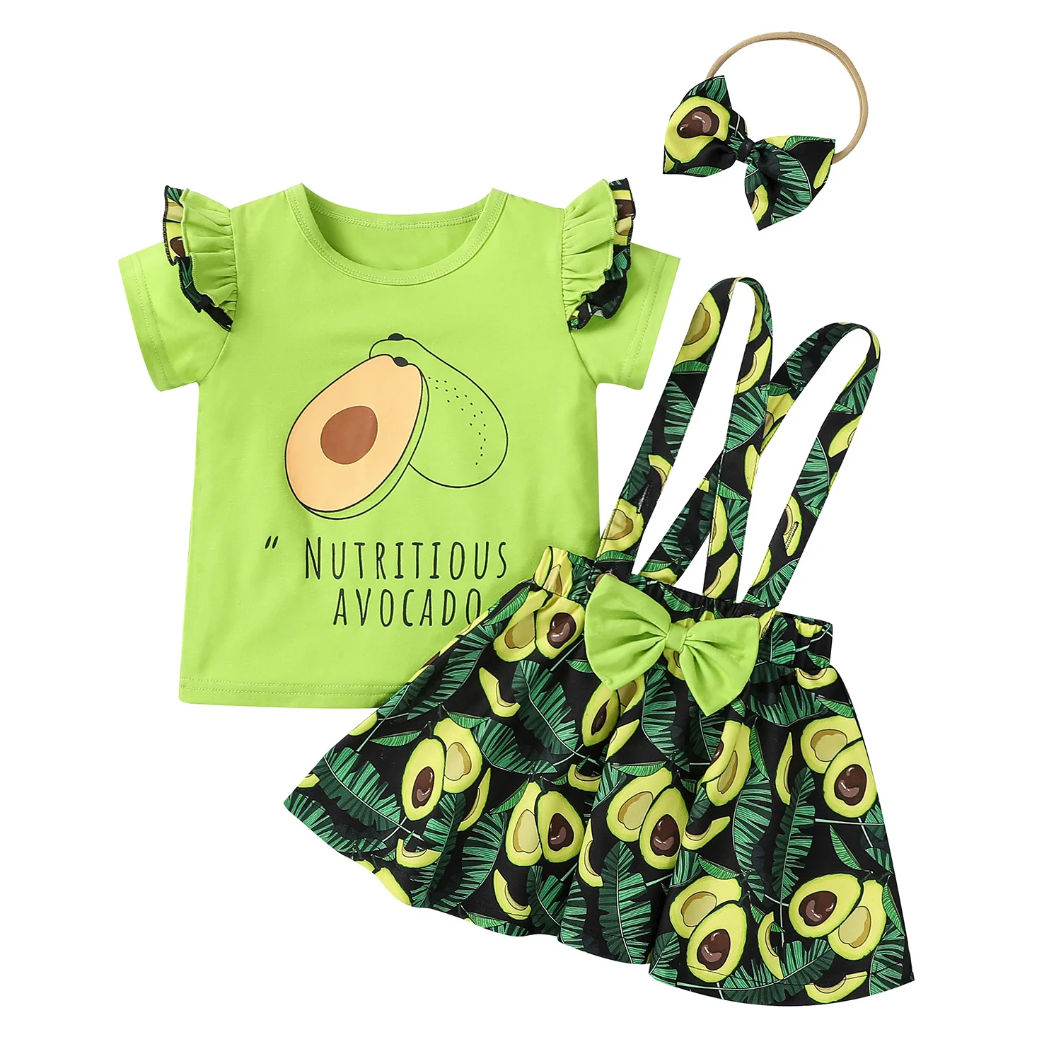 Детская Юбка для маленьких девочек, костюм из трех предметов, футболка с коротким рукавом и принтом авокадо и юбка с бантом на подтяжках и ободок