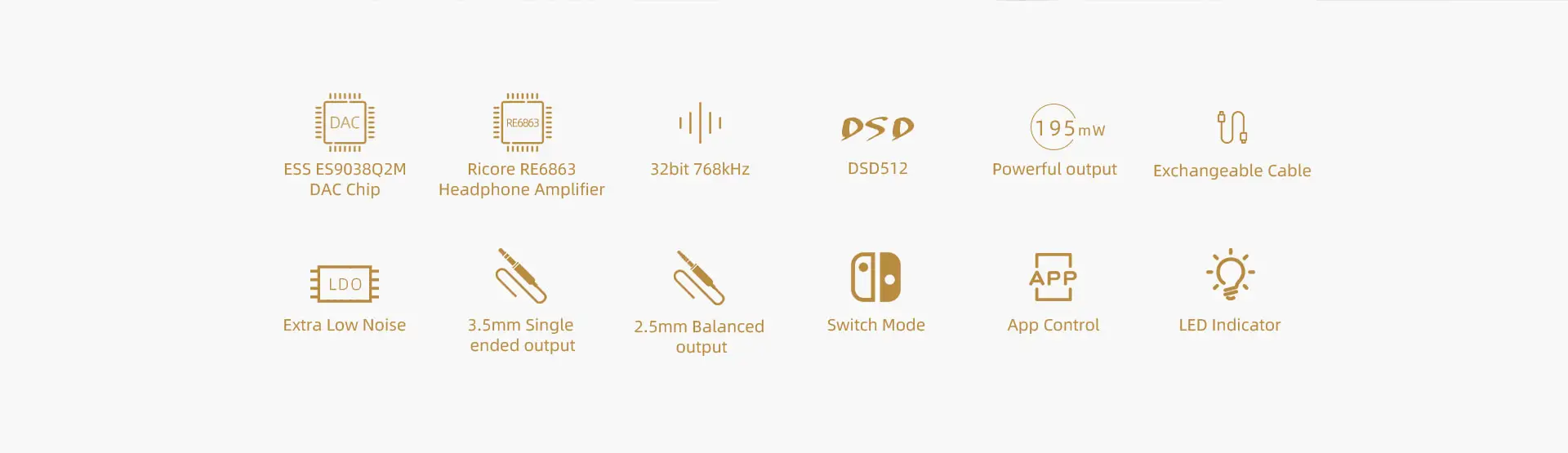 -Продвинутая модель мкА.-Сменные кабели с разъемом USB-C.-Совместимость с Android, компьютерами и iOS *.-Специальный режим совместим с Nintendo Switch.-Односторонний выход 3,5 мм и сбалансированный выход 2,5 мм.-Усилитель ESS ES9038Q2M DAC & Ricore RT6863.-Выходная мощность до 195 МВт @ 32.-Поддержка высокой четкости до PCM 32/768 и DSD512.-Расширенные настройки доступны в приложении-компаньоне.Спецификация:Размеры: 54x18x9 ммВес: 12,6 г (без кабеля)Входящие в комплект аксессуары: кабель от USB-C до USB-C, адаптер USB A* Кабель Lightning для использования с iOS будет доступен отдельноСбалансированный выход 2,5 ммВыходная мощность: 195 мВт при 32 ОмЧастотный диапазон: 20 50 000 ГцTHD + N: 0.0008%Динамический диапазон: 120 дБСоотношение сигнал-шум: 116 дБРазделение каналов: 109 дБВыходное сопротивление: 1,6 ОмОдносторонний выход 3,5 ммВыходная мощность: 125 мВт при 32 ОмЧастотный диапазон: 20 50 000 ГцTHD + N: 0.0008%Динамический диапазон: 122 дБСоотношение сигнал-шум: дБРазделение каналов: 76 дБВыходное сопротивление: 0,8 Ом