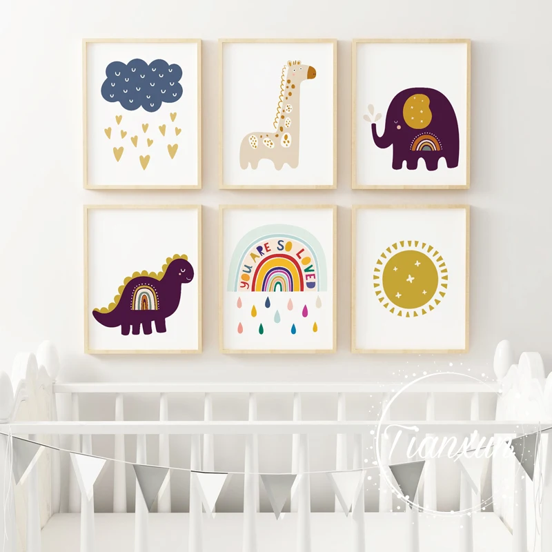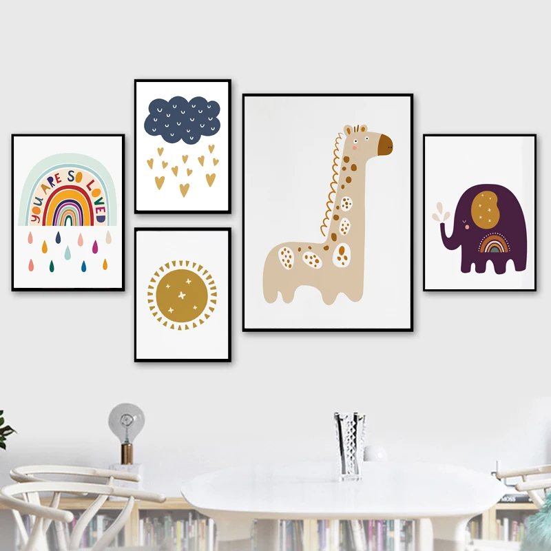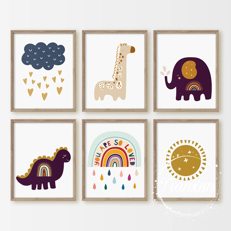 Мультфильмов животных Радуга картины стены искусства плакат детская полотна номер картины для декоративный для детской комнаты принты настенный плакат