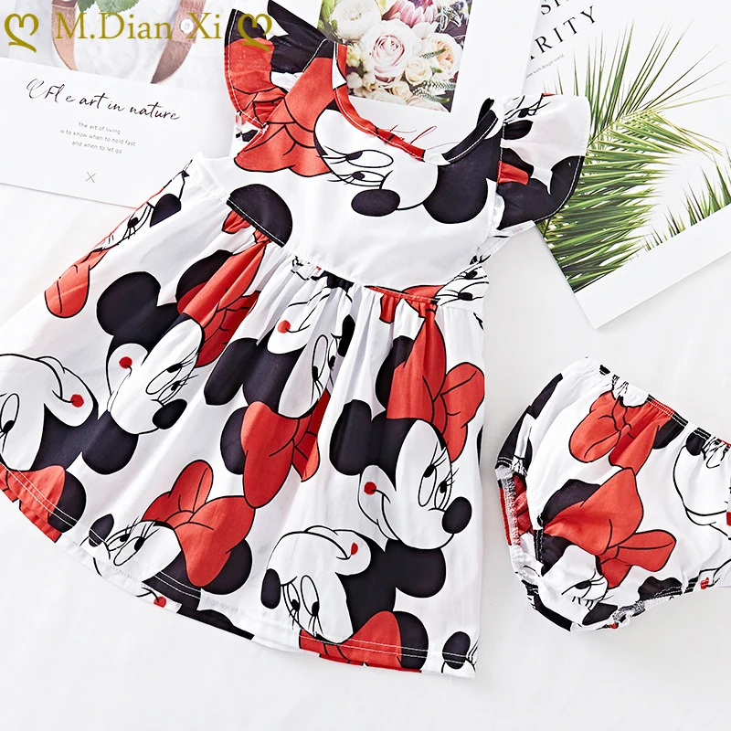 Платье для маленьких девочек, летнее платье с летящим рукавом, хлопковое платье с Минни и трусики для маленьких девочек, 2 шт.