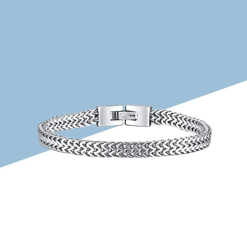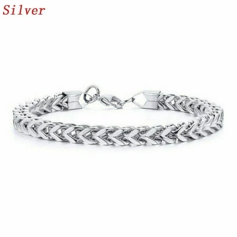 Материал: сплавПроцесс обработки: Гальваническое покрытиеТип: БраслетСтиль: МужскойПродукция включает: 1 браслетУпаковка: индивидуально упакованнаяЦвет: серебристый/золотой/черныйВес: около 20 г