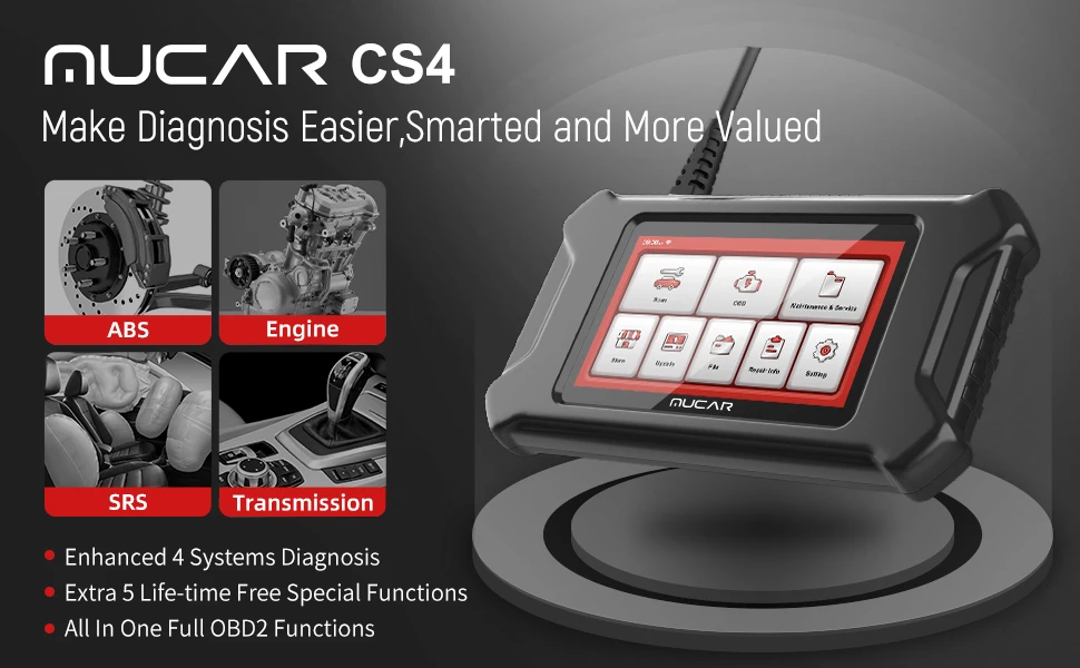 Этот Автомобильный сканер obd2 способен считывать и устранять коды неисправностей двигателя ABS/SRS/ECM/TCM.1. Диагностика АБС: путем доступа к системе ABS для просмотра его прямого потока данных и получения кодов неисправностей, этот сканер может устранить проблему ABS с визуальным контролем всех тормозных компонентов, вызвавших предупреждающий светильник, и выключить светильник.2.SRS Диагностика: путем обнаружения всех электронных параметров в системе SRS, чтобы проверить их состояние здоровья, этот диагностический инструмент может своевременно решить возможные проблемы SRS, чтобы обеспечить безопасность вашего вождения, И выключите предупреждающий светильник подушки безопасности.3. Диагностика ECM: вы можете диагностировать систему двигателя через порт ecu obd2, поддерживает все 10 режимов тестирования OBDII, таких как данные в реальном времени, Тест датчика O2, тест компонентов и многое другое; прочитайте и очистите коды ошибок двигателя, узнайте точную проблему, отремонтируйте ее и выключите светильник двигателя MIL.4.TCM Диагностика: AT-это набор передач, используемых для координации скорости двигателя и фактической скорости колеса, который используется, чтобы дать полную игру для лучшей производительности двигателя. Сканер MUCAR CS4 obd2 может считывать/очищать коды и просматривать данные в реальном времени, получая информацию об ошибке по адресу.5.BCM Диагностика: провести диагностику неисправностей на теле/раме/системе передачи/системе рулевого управления/тормозной системе/системе вождения.6. Диагностика TPMS