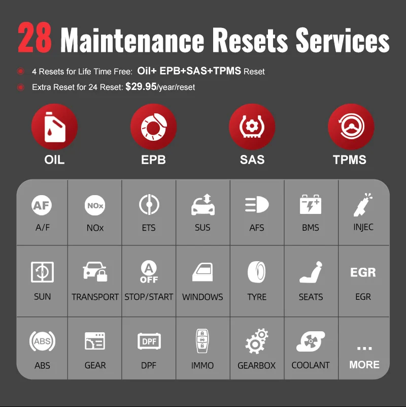 Поддержка 28 услуг сброса (масло/EPB/SAS/TPMS/TBA/ABS Сброс срок службы бесплатно для всех автомобилей)