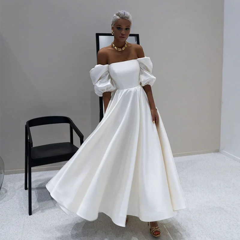 Weiyin винтажные атласные свадебные платья с открытыми плечами короткие пышные рукава длиной до щиколотки трапециевидные Простые Свадебные платья