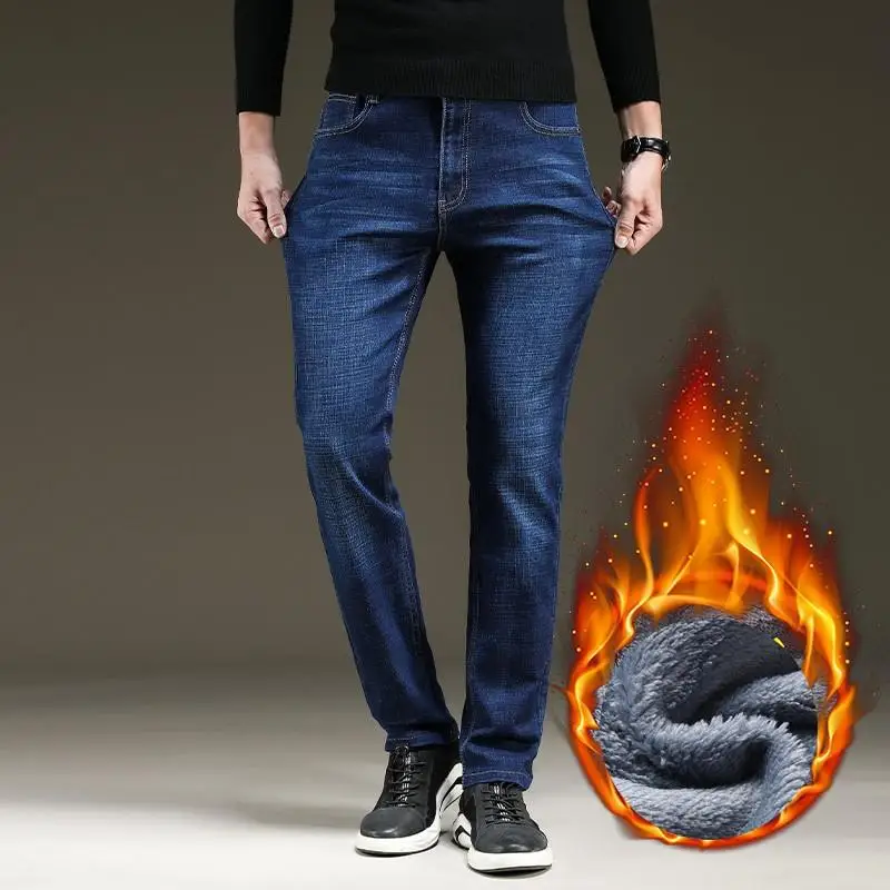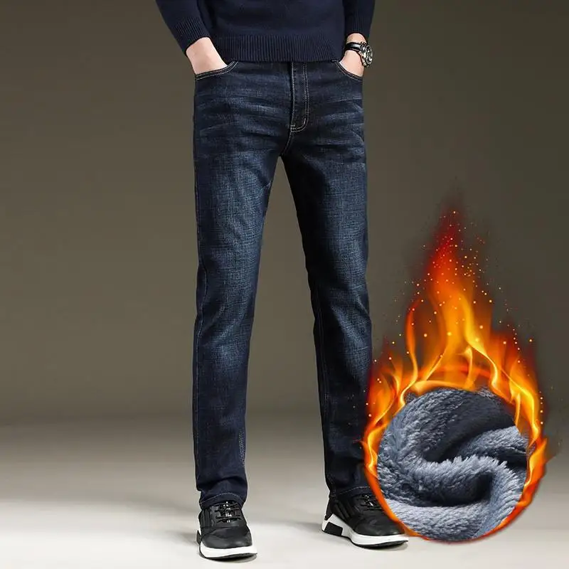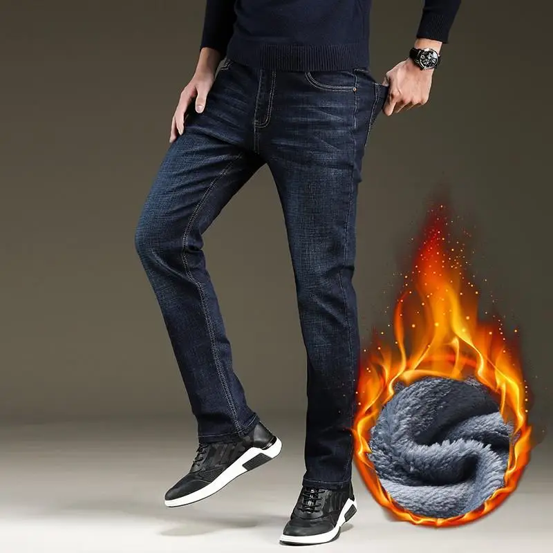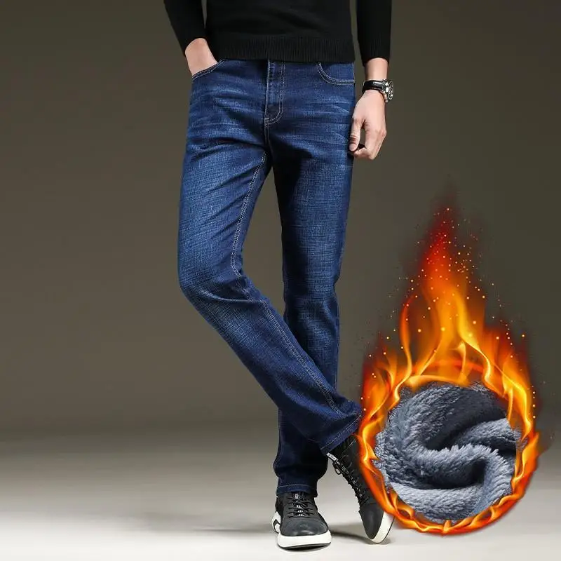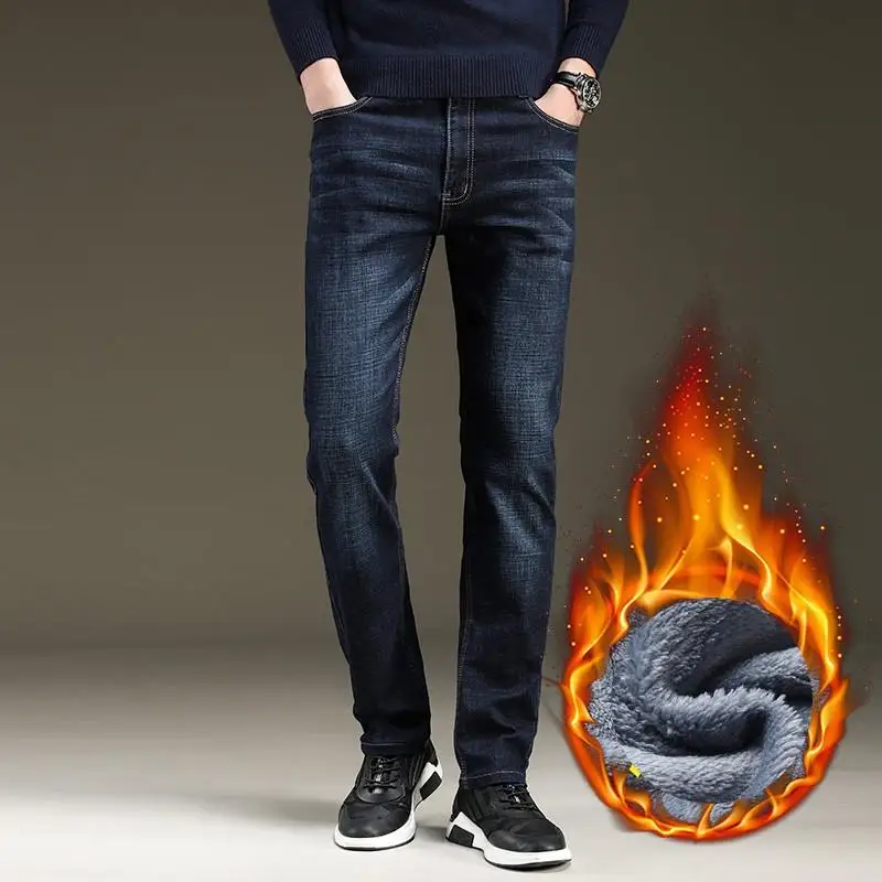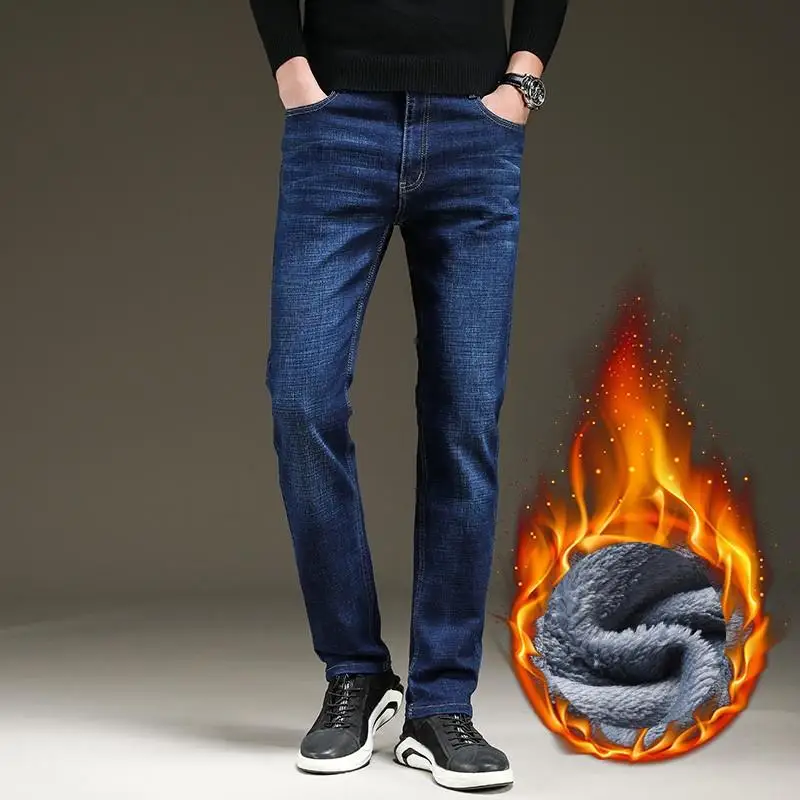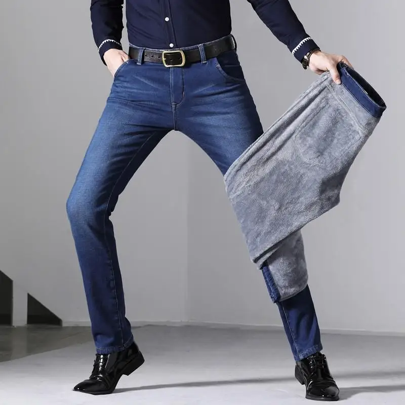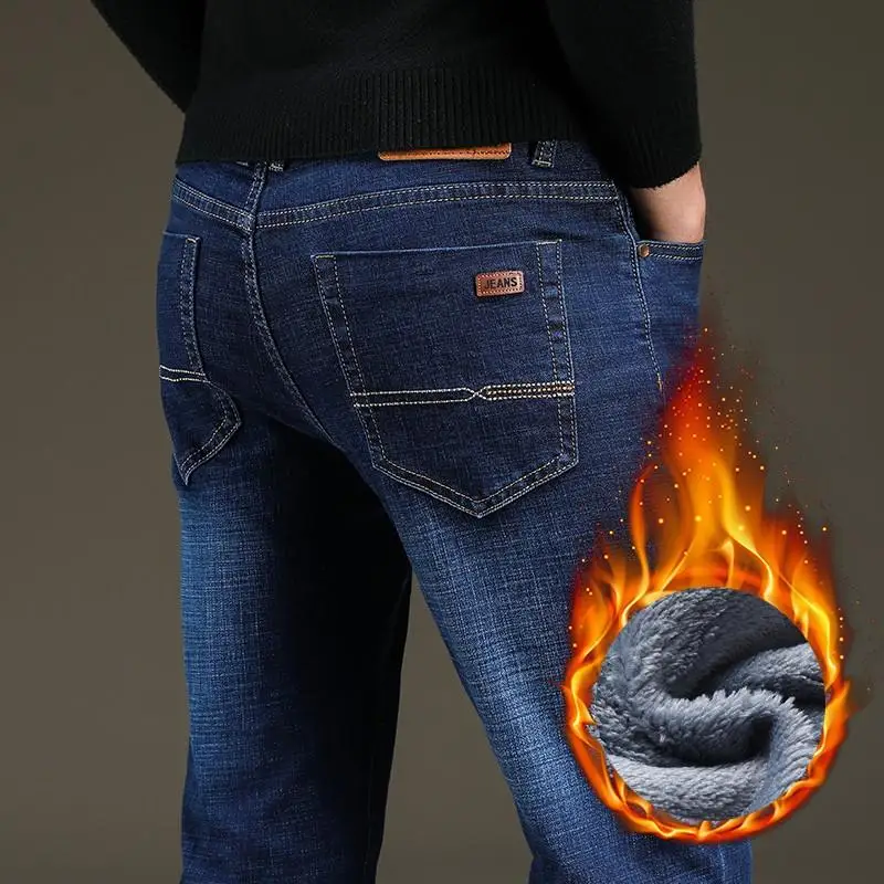 Мужские облегающие джинсы, синие и черные теплые Эластичные Обтягивающие плотные брюки в классическом стиле, новинка для зимы 2021