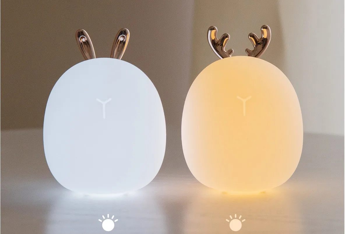 Светильник Цвет: белый/теплый белый свет.Светильник с контролем цвета: переключатель/сенсорный датчик.Источник питания: Встроенный аккумулятор на 900 мАч.Тип зарядки: USB зарядка (DC5V 1A).Время зарядки: около 2 часов.Время работы: около 12 часов.Вес: 145 г.Размер: 143*100*100 мм.Материал: АБС + экологически чистый силикон.Режим: кролик, олень.Стиль: Ночной светильник/настольная лампа/декоративная лампа/окружающий светильник/прикроватная лампа.Костюм для: подарок для детской спальни.Материал изделия-силикагель, мягкий.Он содержит два цвета, теплый и белый, и автоматически переключает цвета при нажатии в течение 3 секунд.