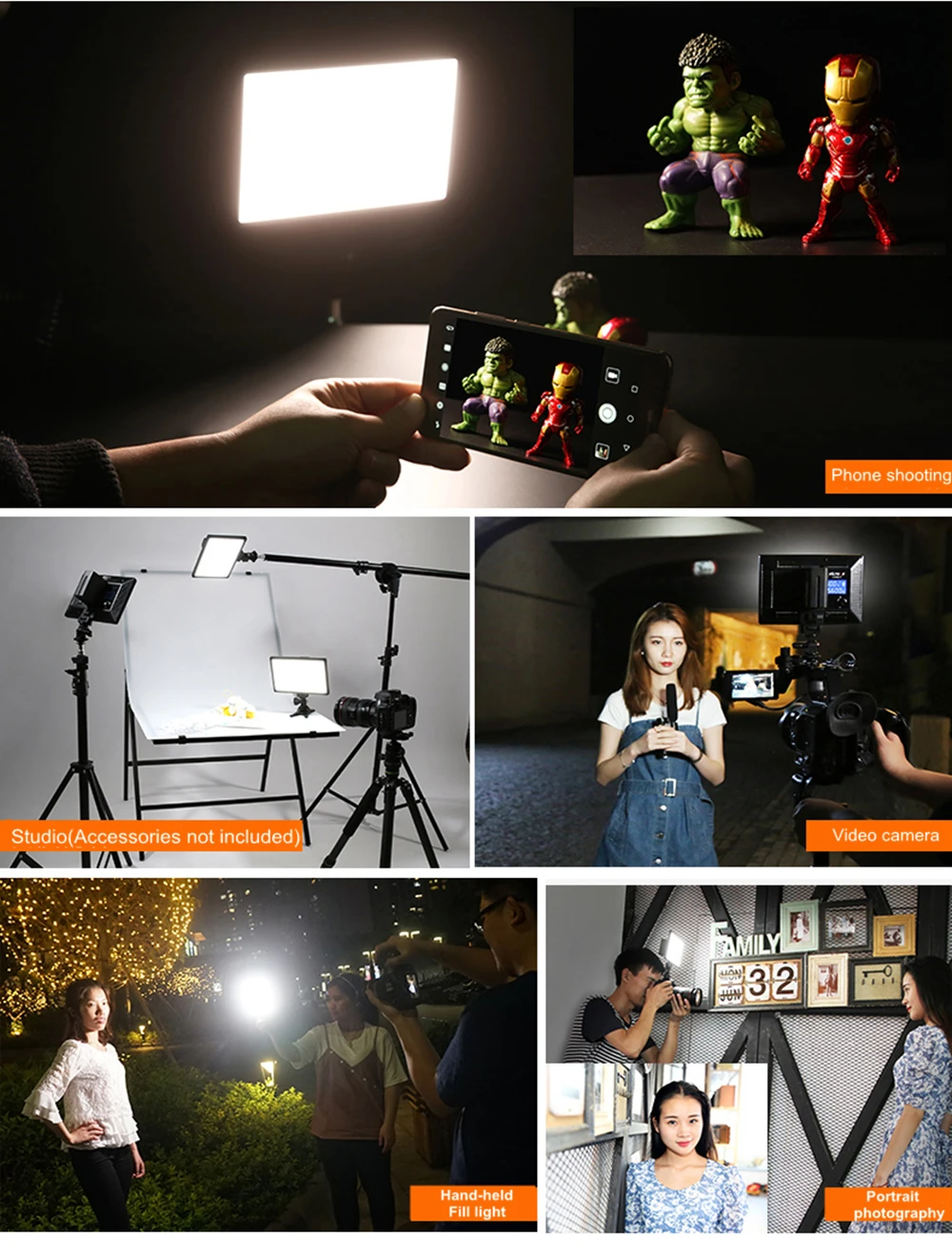 它采用最新的LED蜂窝设计 。 高清液晶显示屏使操作界面清晰明了 。 热靴采用耐用的金属踢脚线 。 它具有高亮度,自然柔和的灯光,稳定的色温 。 您可以无级调节亮度和色温 。 适用于人像,儿童,婚礼等 。 它可以安装在DSLR DV摄录机和三脚架上 。