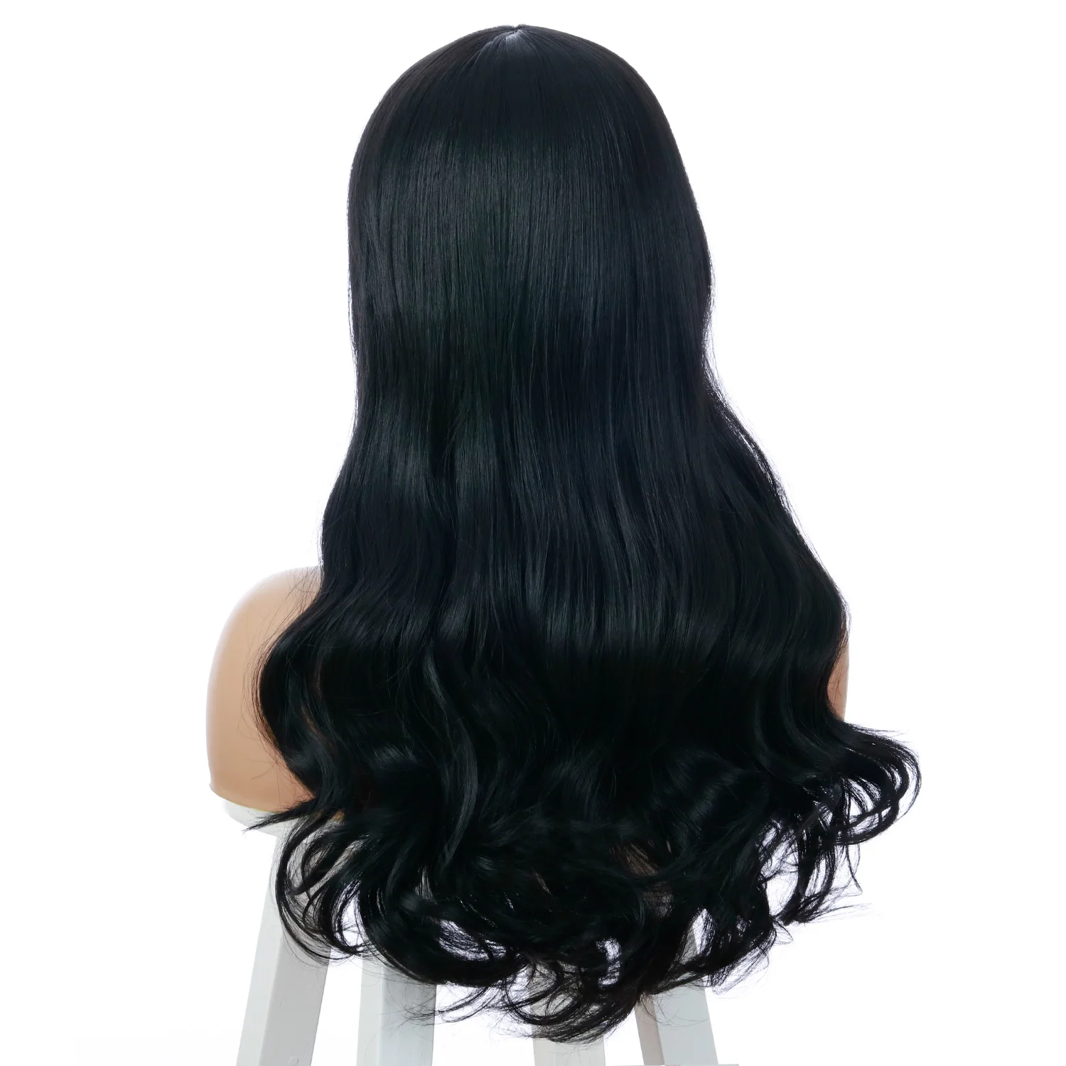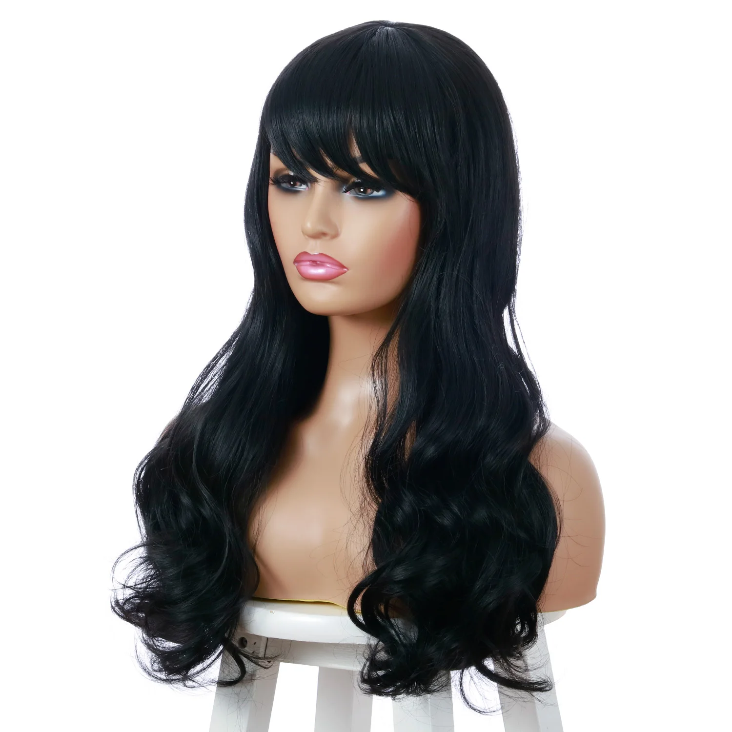 Синтетический длинный волнистый парик для женщин, волосы с челкой, натуральные черные высокотемпературные парики для ежедневного использования