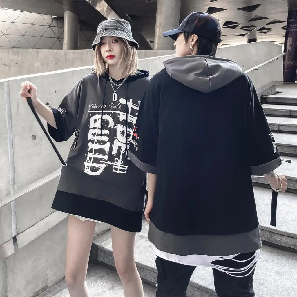 Мужская футболка с капюшоном, летняя свободная футболка с коротким ...