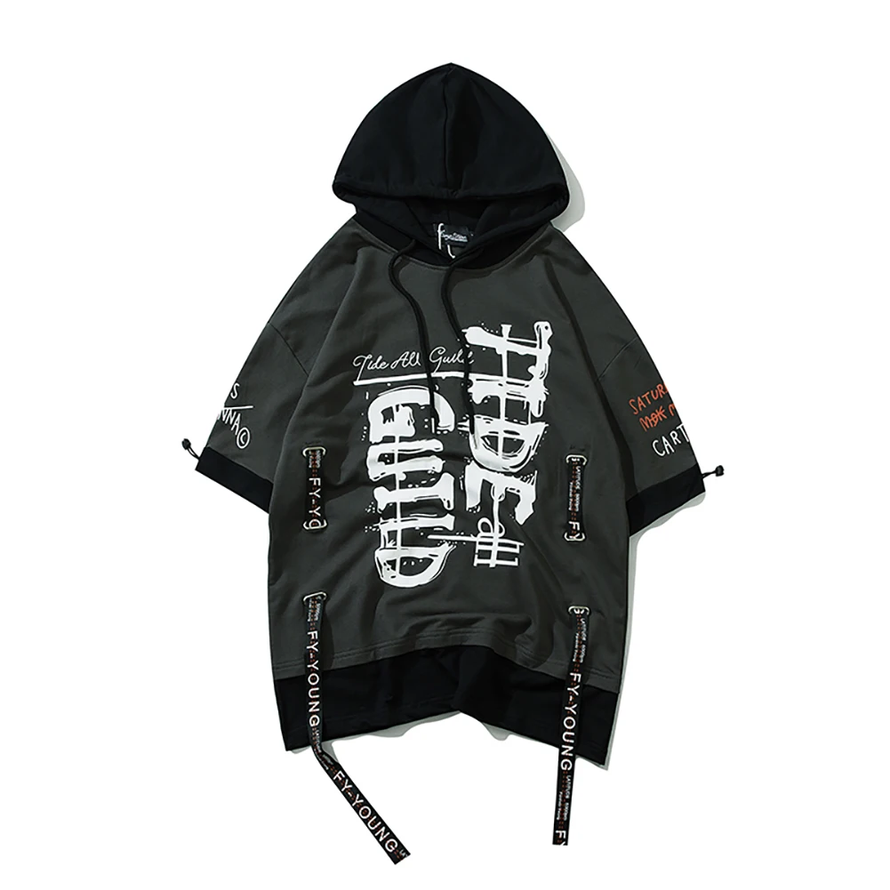 Мужская футболка в стиле хип-хоп, Модная хлопковая футболка в уличном стиле с обманкой из ленты и капюшоном
