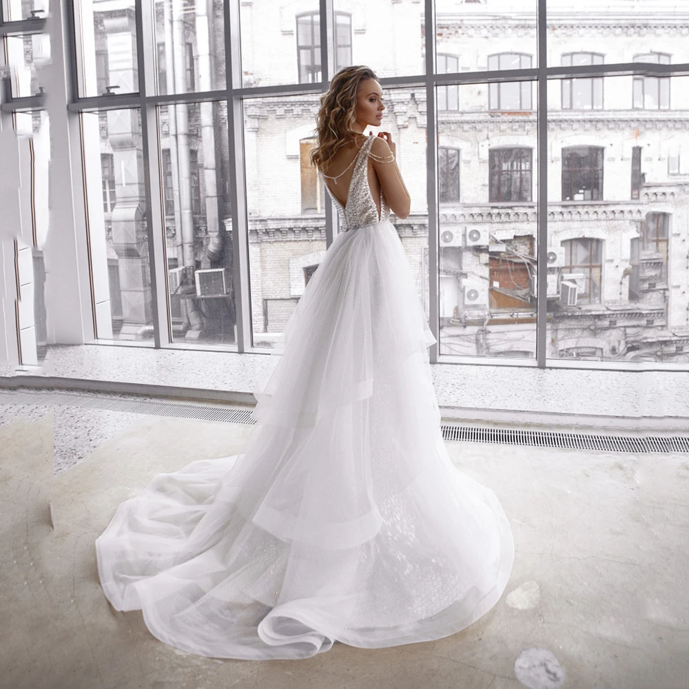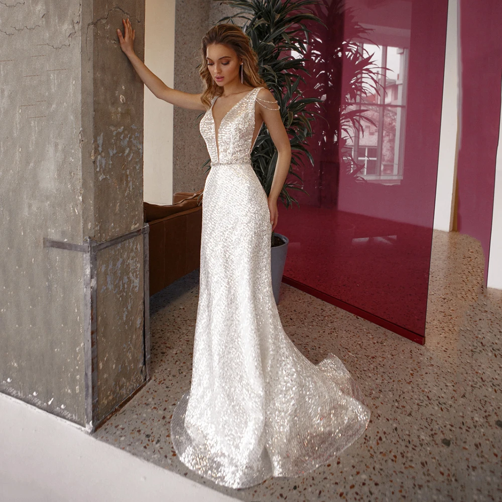 UZN Элегантное свадебное платье с блестками и V-образным вырезом, свадебное платье русалки без рукавов, платье невесты с поясом, расшитое бисером, со съемной юбкой