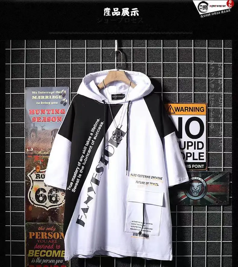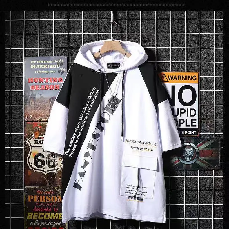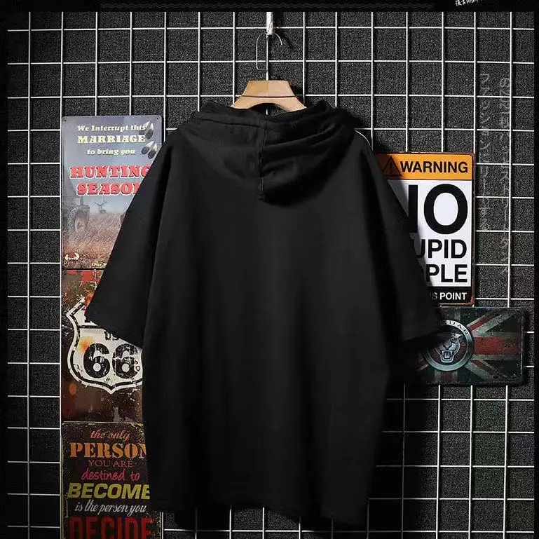 Мужская футболка с капюшоном, летняя свободная футболка с коротким ...