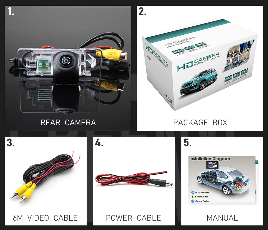 1. Задняя камера2 посылка3. Видеокабель (6 м)4. Кабель питания5. Руководство
