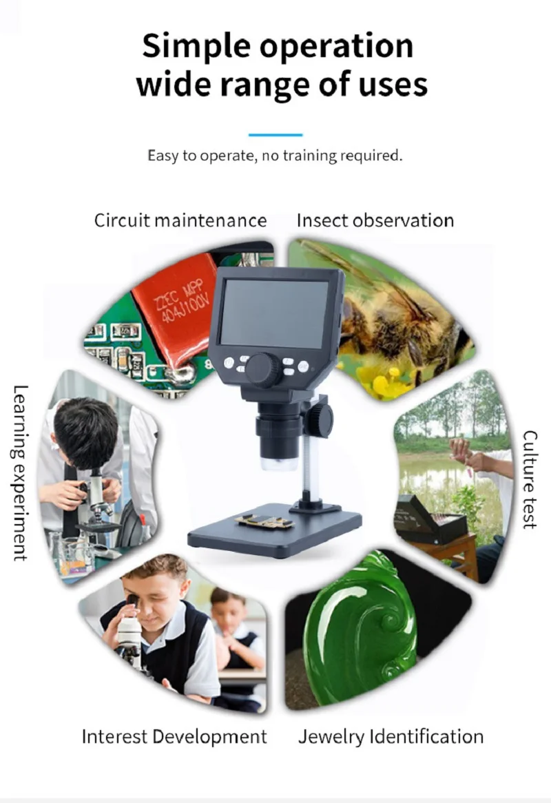 Особенности: Это цифровой микроскоп непрерывного зума, и он имеет широкий спектр наблюдений. От 1 до 1000 раз увеличения, вы всегда можете найти подходящее несколько, чтобы увидеть объект. Увеличение: 1-1000 раз система непрерывного усиления. Видео можно сохранить на флэш-карту памяти (карта не входит в комплект). Расстояние объекта: от 10 мм до бесконечности (различные расстояния объекта соответствуют различным многоточечным). Встроенный литиевый аккумулятор может работать непрерывно в течение 4-6 часов. Шестнадцать языковых систем: английский, испанский, русский, корейский, японский, тайский, иврит, Португалия, немецкий, французский, Италия, Турция, Чехия, Польша, традиционный китайский и упрощенный китайский. Он подходит для широкого спектра отраслей: контроль качества различных типов заводов, учебные пособия для различных предметов, наблюдение за кожей и волосами, развитие детских интересов и увлечений, идентификация ювелирных изделий и алмазов, печатных плат, точного оборудования, биологии, минералов, печати, ткани, антиквариата. Этот продукт был улучшен по проблеме высокого отражения, это цифровой микроскоп, который может регулировать угол. Эта машина оснащена 8 яркий светодиодный. Изменение температуры цвета в зависимости от погодных условий Характеристики: Материал: АБС + металл Цвет: черный + серебристый Материал кронштейна: Алюминиевый пластик, металл (опционально) Пиксели: 8 миллионов пикселей высокой четкости Дисплей экран: 4,3 дюйма высокой четкости ЖК-дисплей Дисплей Увеличение: 1-1000 раз система непрерывного усиления Видео можно сохранить на флэш-карту памяти (пожалуйста, используйте скорость карты класса 10, карта не включена.) Расстояние объекта: от 10 мм до бесконечности (различные расстояния объекта соответствуют различным размерам.) Аккумулятор: 1 * литиевая батарея, 2500 мАч (в комплекте) Время работы: 4-6 часов Время зарядки: 6-8 часов Шестнадцать языковых систем: английский, испанский, русский, корейский, японский, тайский, иврит, Португалия, немецкий, французский, Италия, Турция, Чехия, Польша, традиционный китайский и упрощенный китайский. Светодиодный светильник бусы Количество: 8 яркий светодиодный светильник бусины Размер посылка: 210*170*90 мм/8,3*6,7 * 3.5in Вес посылка: 520 г/1.1lb Информация об эксплуатации машины: Настройка разрешения: (Высокое разрешение. F-Высокое разрешение) Качество изображения: 1 м, 2 м, 3 м, 5 м, 6 м, 8 м Циклическая Съемка камеры: 3 минуты, 5 минут, 10 минут Баланс белого: автоматический, солнечный свет, облачно, Вольфрамовая Лампа накаливания, люминесцентная лампа Компенсация экспозиции: 2 + 1 + 0 -1 -2 Отметка времени: вкл/выкл Настройка времени: год, месяц и день Автоматическое выключение: выключение, 3 минуты, 5 минут, 10 минут Язык: английский, испанский, русский, корейский, японский, тайский, иврит, Португалия, немецкий, французский, Италия, Турция, Чехия, Польша, традиционный китайский, упрощенный китайский Частота переменного тока: 50 Гц/60 Гц Автоматическое выключение экрана: выключено, 3 минуты, 5 минут, 10 минут Формат: ок, отмена Сброс системы: да/нет Упаковочный лист: 1 * микроскоп G1000 1 * кронштейн 1 * кабель для передачи данных 1 * Руководство пользователя
