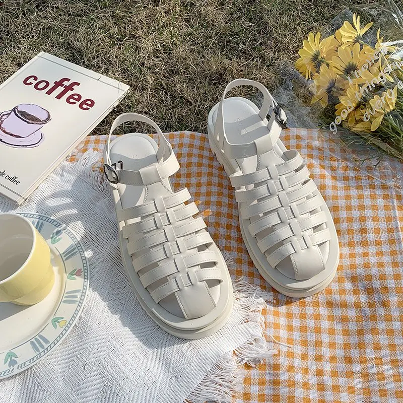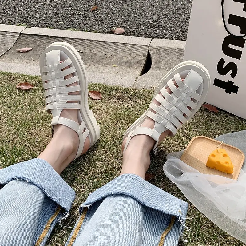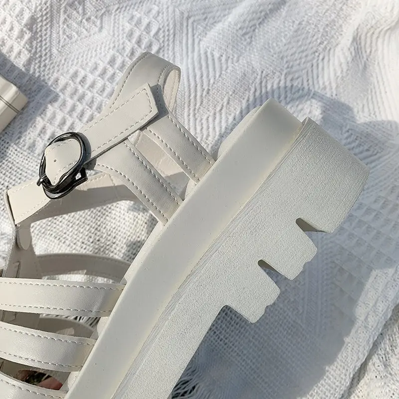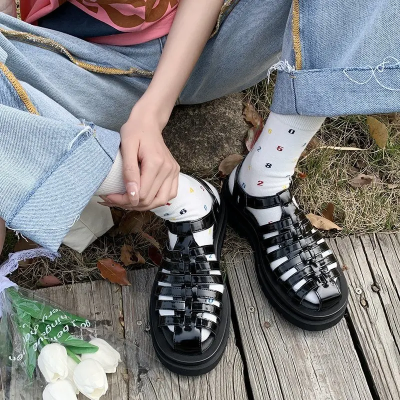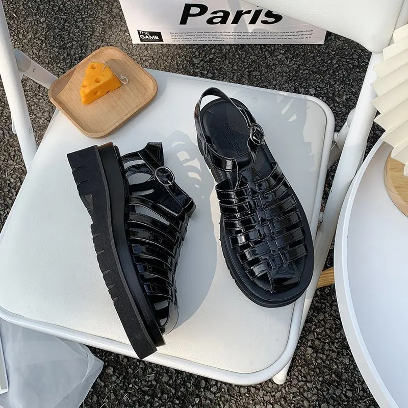 Женские сандалии-гладиаторы, черные, на плоской платформе, с круглым носком, с Т-образным ремешком, AC941, 2021