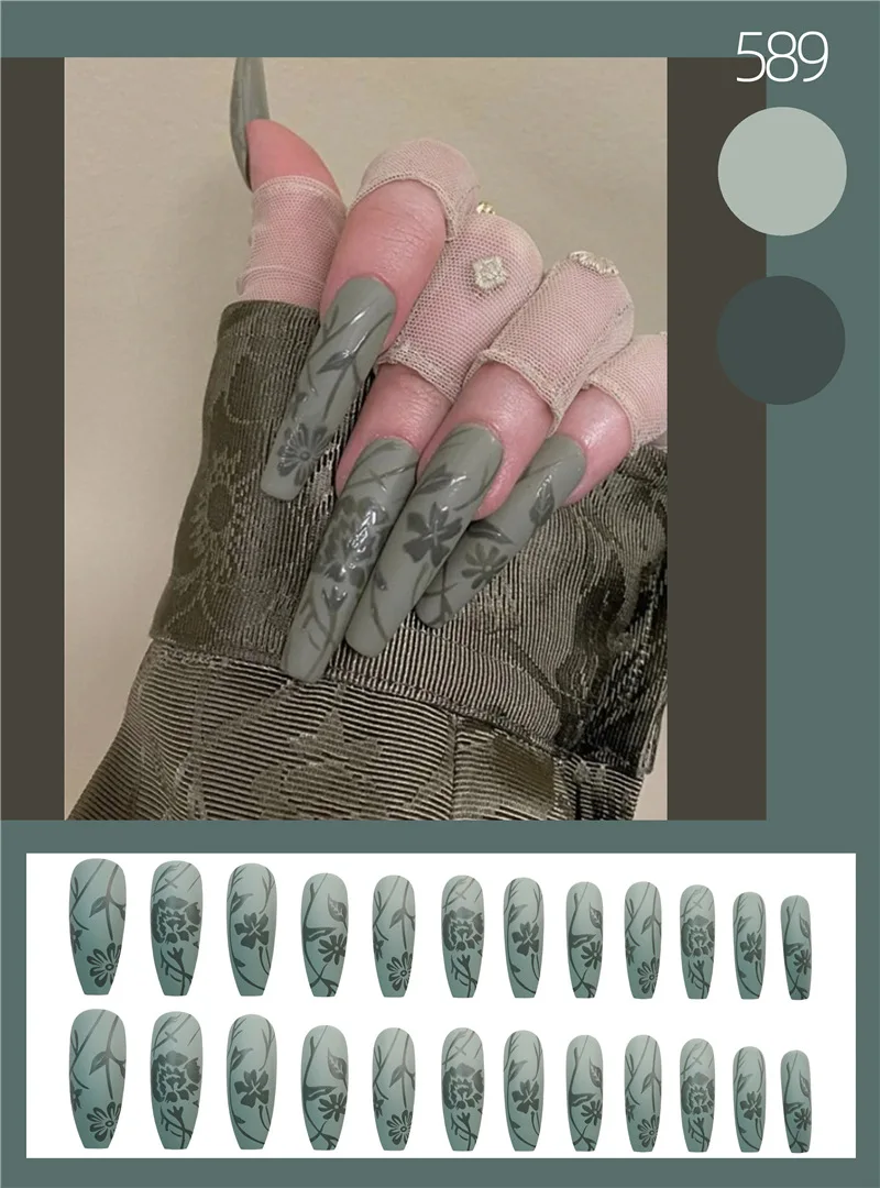 24 шт., многоразовые накладные ногти с зелеными цветами и листьями, модные длинные тыквы, балерина, гроб, накладные ногти, Типсы для ногтей