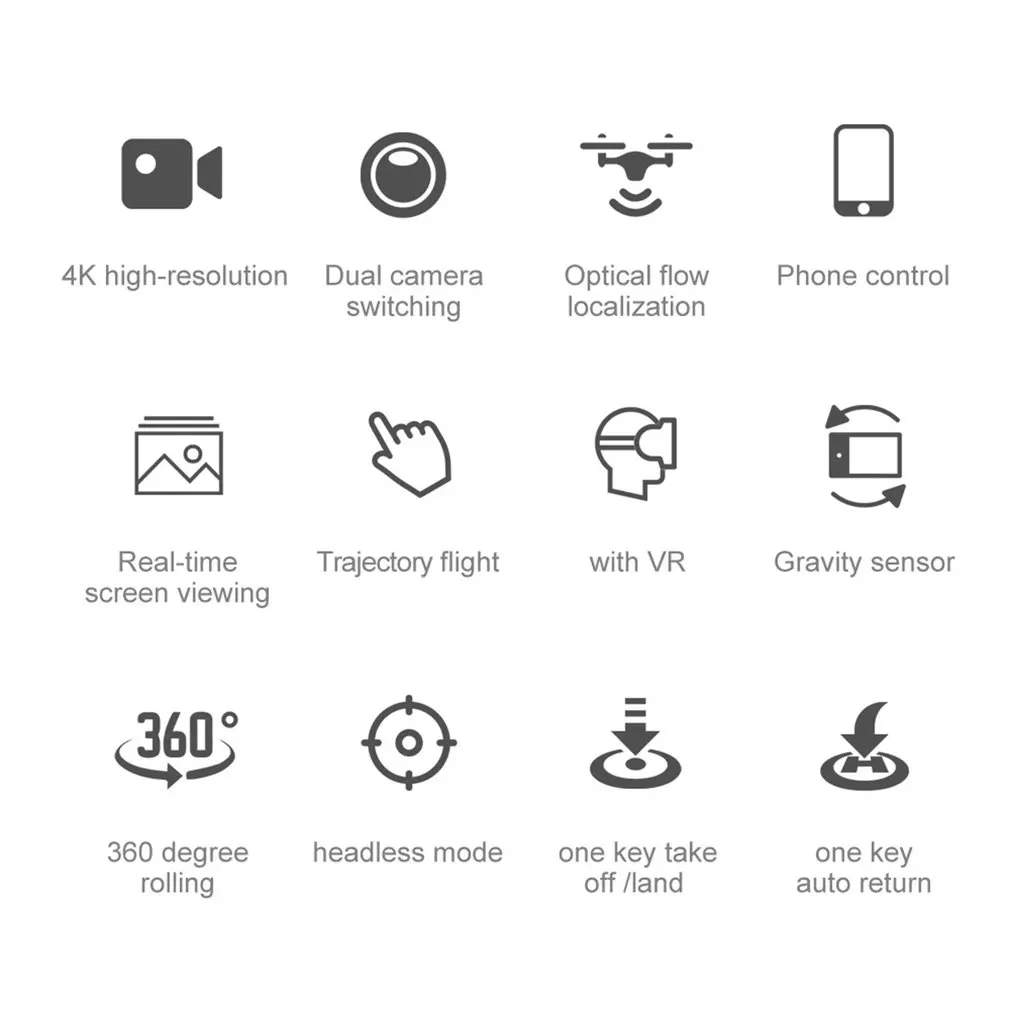 Особенности: 1. С функцией удержания высоты обеспечивает стабильный полет. 2. С функцией Wi-Fi можно подключать приложение, систему APK для съемки, видео, передачу в режиме реального времени через Изображение камеры телефона. 3. С 4K широкоугольной одиночной камерой обеспечивает широкий диапазон изображения и видео высокого качества. 4. С привлекательным режимом без головы, полностью решая проблемы "потеря ориентации". 5.2.4 ГГц Радиоуправление, легко регулировать частоту. 6,6 оси гироскопа сильная стабильность, легко выполняйте различные маневры в воздухе, сильное сопротивление ветра, легче контролировать. 7. С 3D флипами 360 ° (непрерывный рулон). Описание: 1.LF609 Wifi FPV RC Дрон Квадрокоптер с 4K камерой, может летать как внутри, так и снаружи. 2. Функция: видео/фотография/подъем и вниз/вперед и назад/влево и вправо поворот/влево и вправо полет/парение/вращение на 360 градусов/установка высоты/режим удержания высоты/режим Безголового/светодиодный светильник. Характеристики: Номер товара. : LF609 Материал: АБС-пластик Цвет: черный, белый (по желанию) Камера: фото/видео: WIFI FPV: 4K Угол объектива: фиксированный 45 градусов Модель двигателя: двигатель 816 Батарея квадрокоптера: 3,7 V 1800mAh литиевая батарея (1 шт/2 шт/3 шт опционально) Передатчик Батарея: 3x1,5 V AA Батарея (не входит в комплект) Режим передатчика: режим 2 (левая дроссельная заслонка) Время полета: около 18-25 минут Время зарядки: около 90 минут Расстояние управления: около 100 м Размер дрона: (Fold)140x140x6 0 мм/5.46x5.46x2.34in (Unfold)260x200x6 0 мм/10.14x7.8x2.34in Информация о посылка: Размер посылка: 220x180x6 0 мм/8.58x7.02x2.34in Посылка Вес: 466 г/1.03lb Коробка для хранения посылка Посылка включает в себя: 1 x Самолет Передатчик-1 шт. 1 камера (основная версия не входит в комплект) 2 x пропеллера 1 x литиевая батарея (1 шт/2 шт/3 шт опционально) 1 x зарядный кабель 4 x защитный чехол 1 отвертка 1 х Руководство Примечание: Основная версия не включает камеру.
