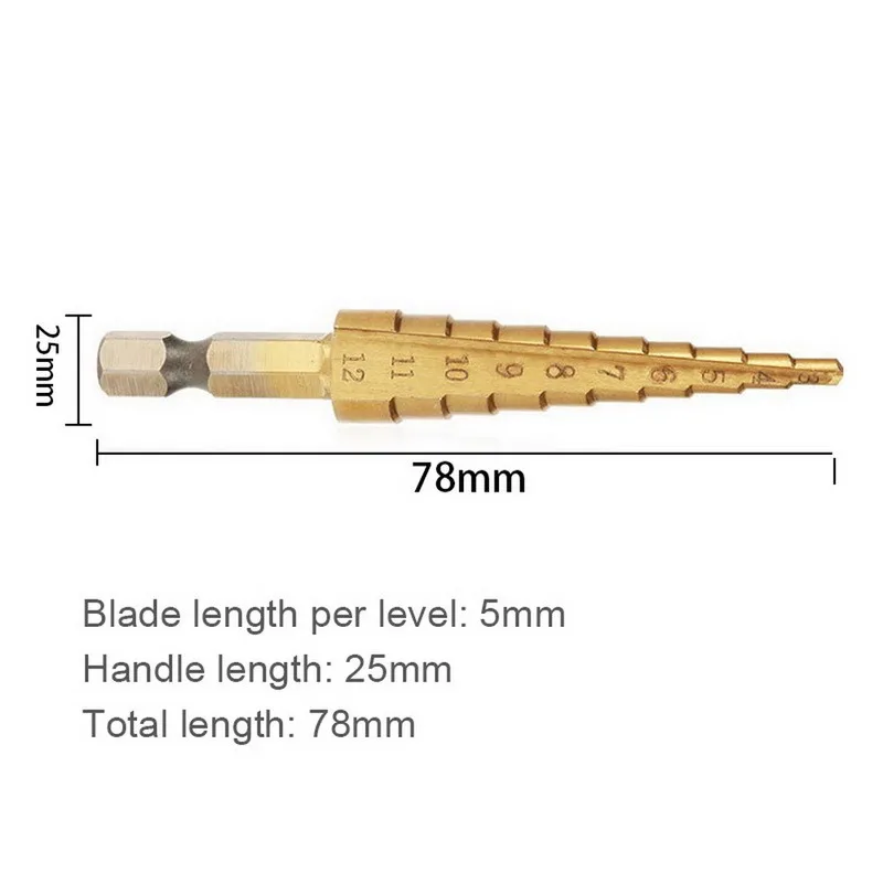 Особенности:** Широко используется: ступенчатое сверло может сверлить в пластике, алюминии, меди, нержавеющей стали и многих других типах листового металла.** Материал хорошего качества: Высокоскоростная сталь с титановым покрытием хорошо подходит для большинства применений общего назначения, предлагая сочетание твердости и прочности для износостойкости, долговечности и долговечности** Титановое покрытие: титановое сверло с титановым покрытием для круговой работы, может эффективно продлить срок службы сверла.** Ступенчатое сверло: уникальный дизайн бит с лестничной структурой, ступенчатое сверло может использоваться для открытия отверстий различных размеров.** Хорошая производительность: наконечник с разделенной точкой увеличивает скорость резки с самоцентрированием и предотвращает ходьбу. Двухфлейтовый дизайн быстрее очищает чипы и позволяет частицам легко, плавно резать.** Применение: может точно сверлить металл, дерево, сталь и пластик, другие поверхности** Размер: Размер бит s включает 3 мм, 4 мм, 5 мм, 6 мм, 7 мм, 8 мм, 9 мм, 10 мм, 11 мм, 12 мм