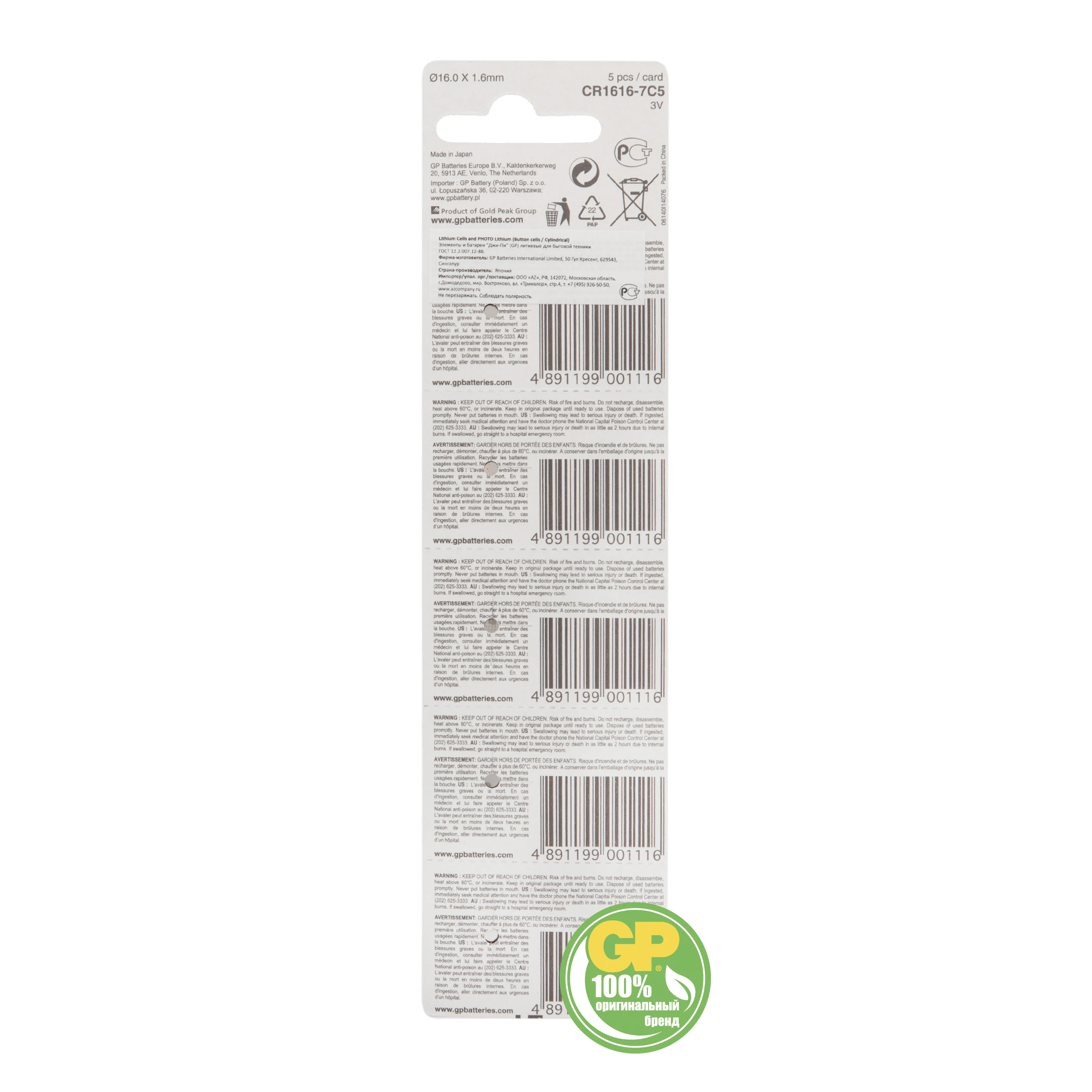 • Миниатюрные литиевые батарейки GP CR1616RA-7C5 входят в большую группу «специальных элементов питания» и предназначаются для портативных электронных устройств совершенно различного назначения.