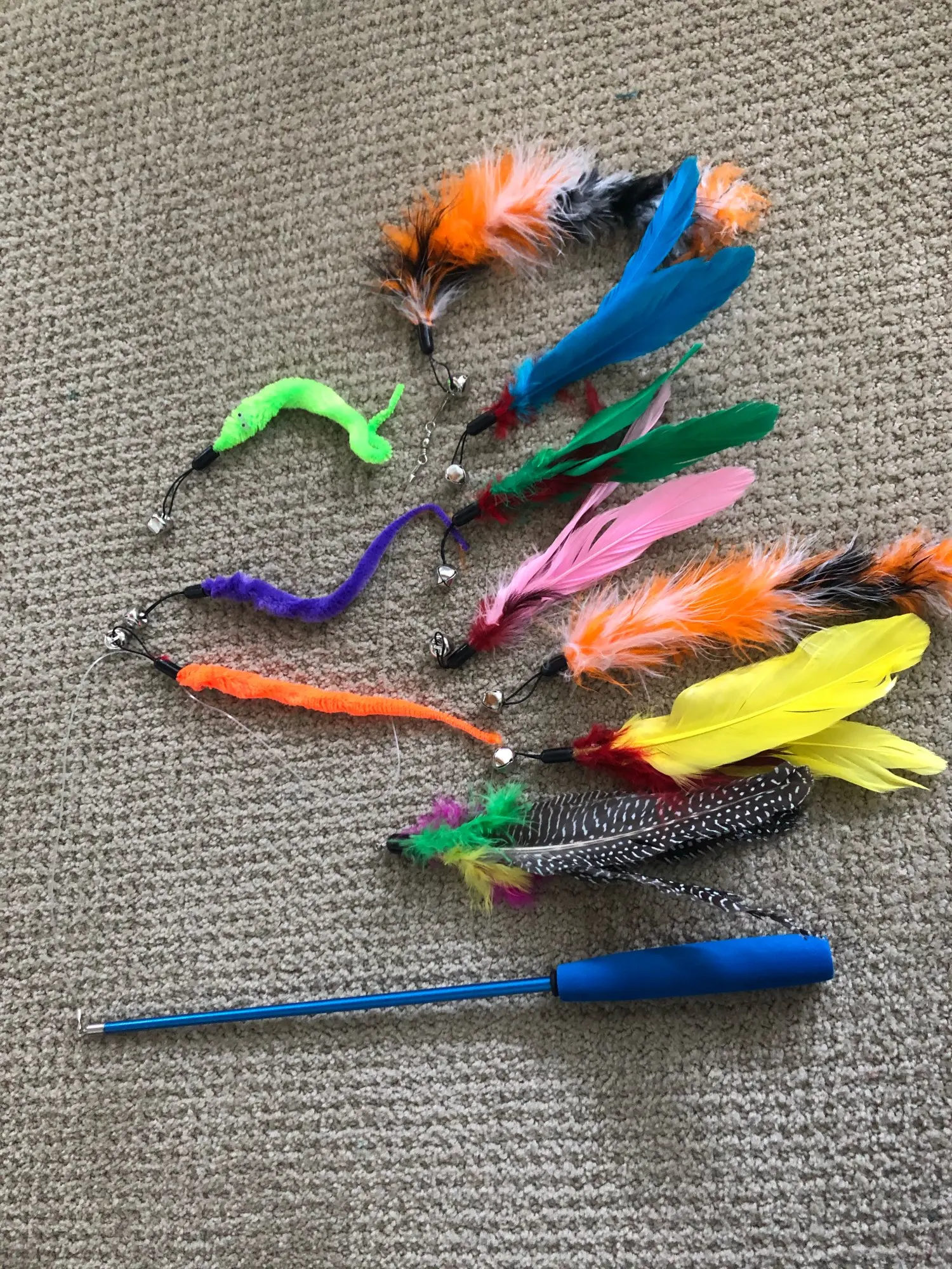 Очень забавно! Вложения были приклеены вместе с клеем (?), поэтому я должен был разобрать их, но они работают на телескопической палке. Палка гибкая и хорошего качества (вытяните верх, чтобы растянуть). Хорошие упражнения для нашего кота!